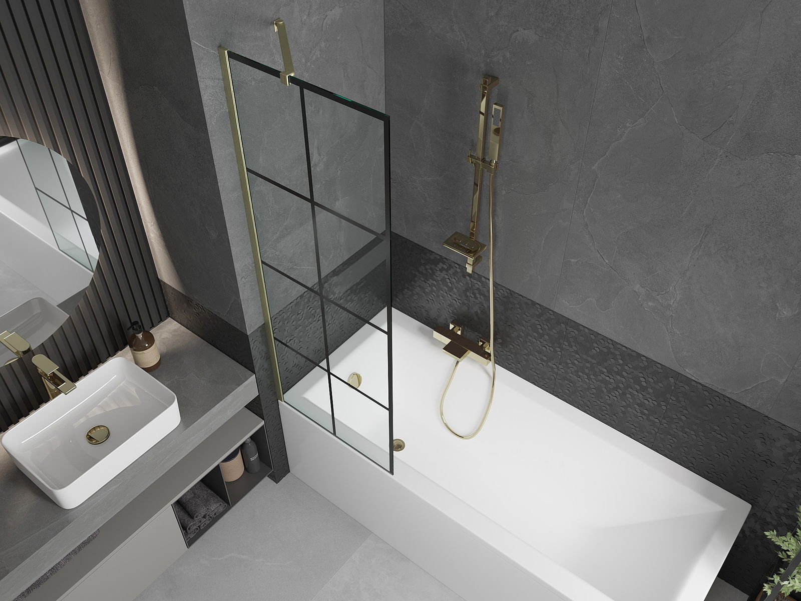 Mexen Next vanová zástěna jednokřídlá 60 x 150 cm, černá mřížka, zlatý kartáčovaný - 895-060-000-00-77-55