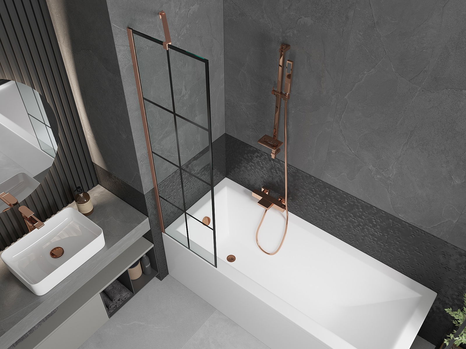 Mexen Next jednokřídlá vanová zástěna 50 x 150 cm, černá mřížka, kartáčovaná měď - 895-050-000-00-77-65