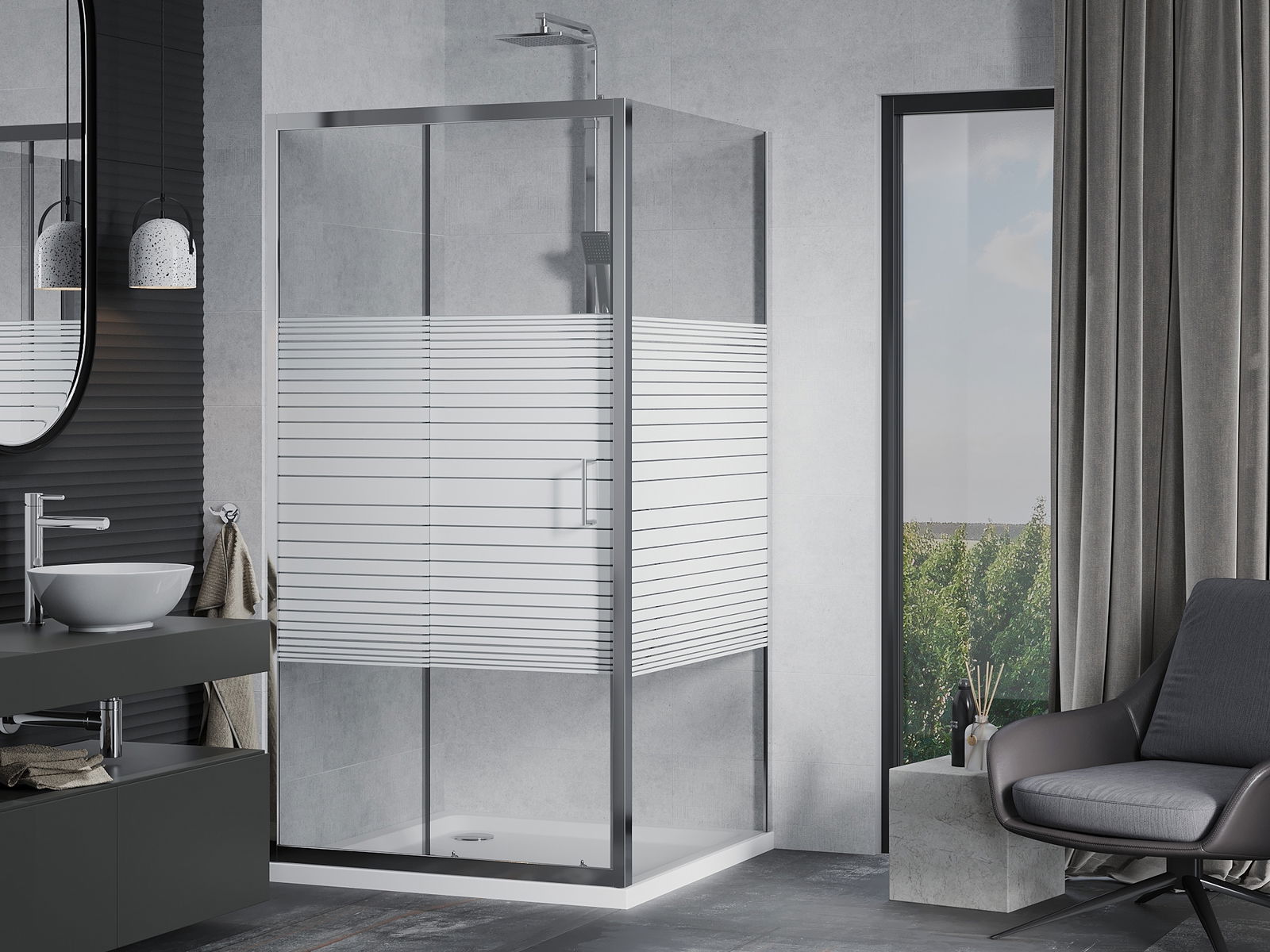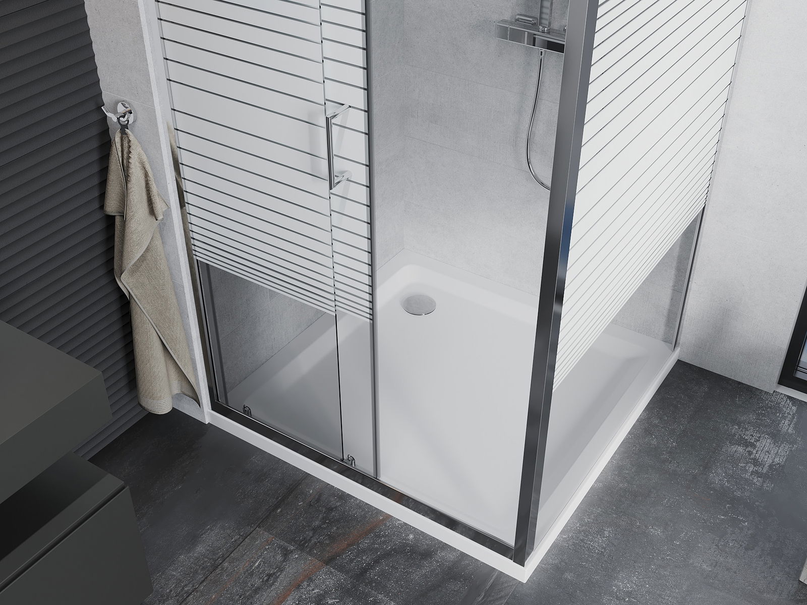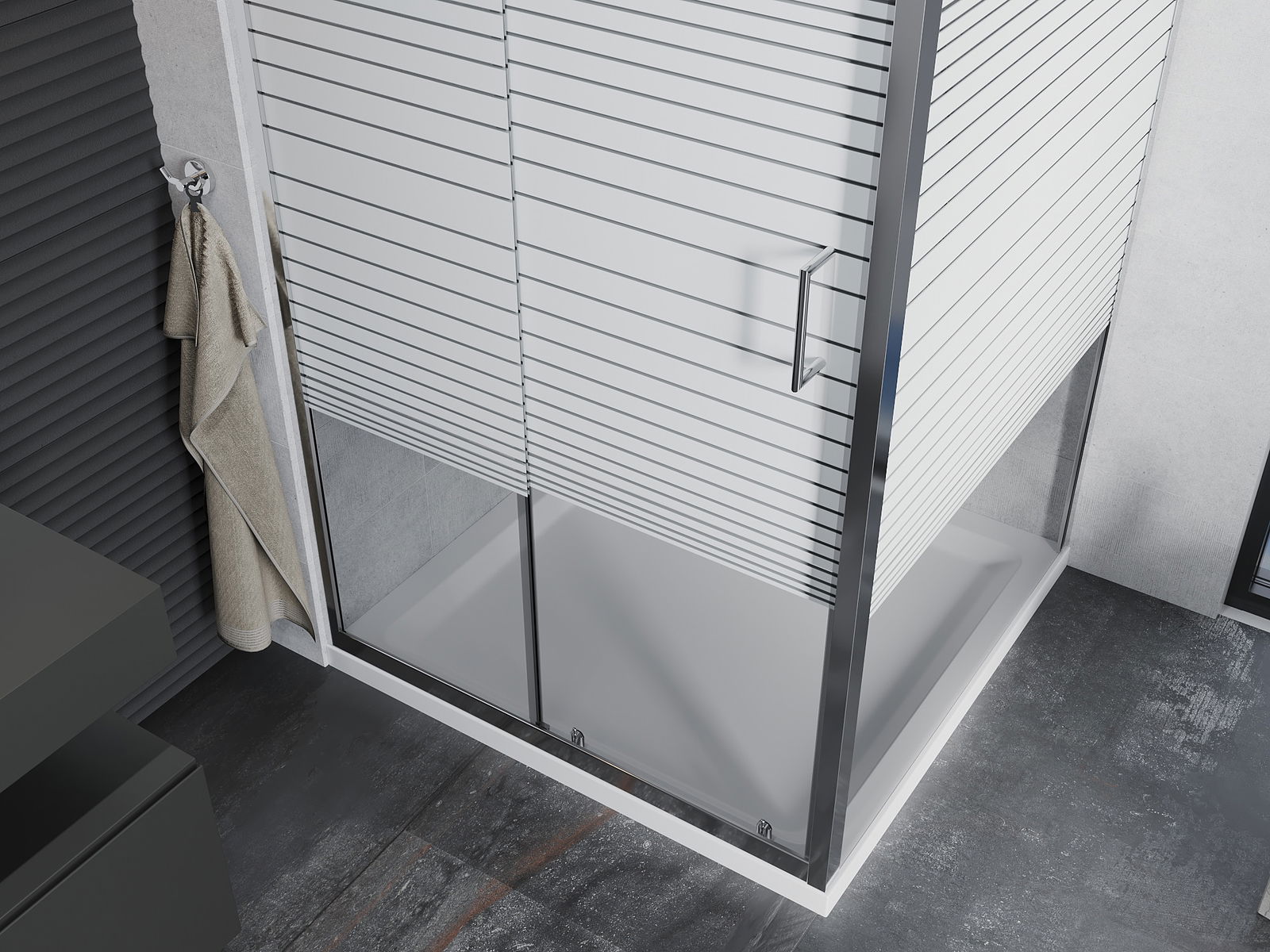 Praktická a pohodlná rukojeť je vyrobena z odolného a trvanlivého kovu. Moderní tvar ve spojení s povrchovou úpravou, která ladí s barvou profilů, dodává celku moderní a stylový vzhled, zdůrazňující estetiku každé koupelny.