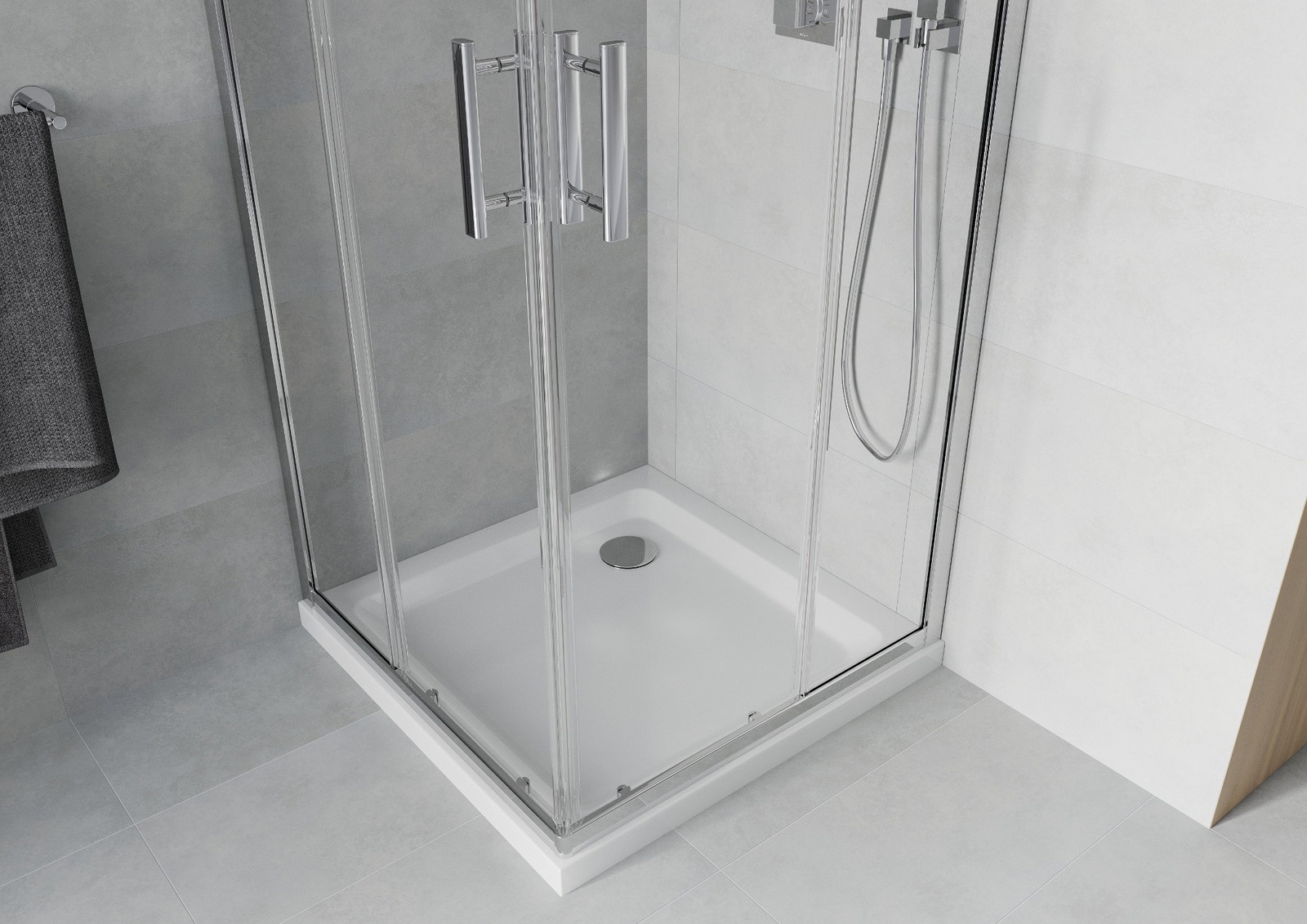 Praktická a pohodlná rukojeť je vyrobena z odolného a trvanlivého kovu. Moderní tvar ve spojení s povrchovou úpravou, která ladí s barvou profilů, dodává celku moderní a stylový vzhled, zdůrazňující estetiku každé koupelny.