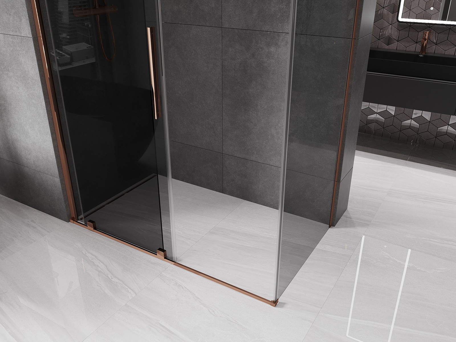Mexen Velar posuvný sprchový kout 130 x 75 cm, grafit, růžové zlato - 871-130-075-41-60