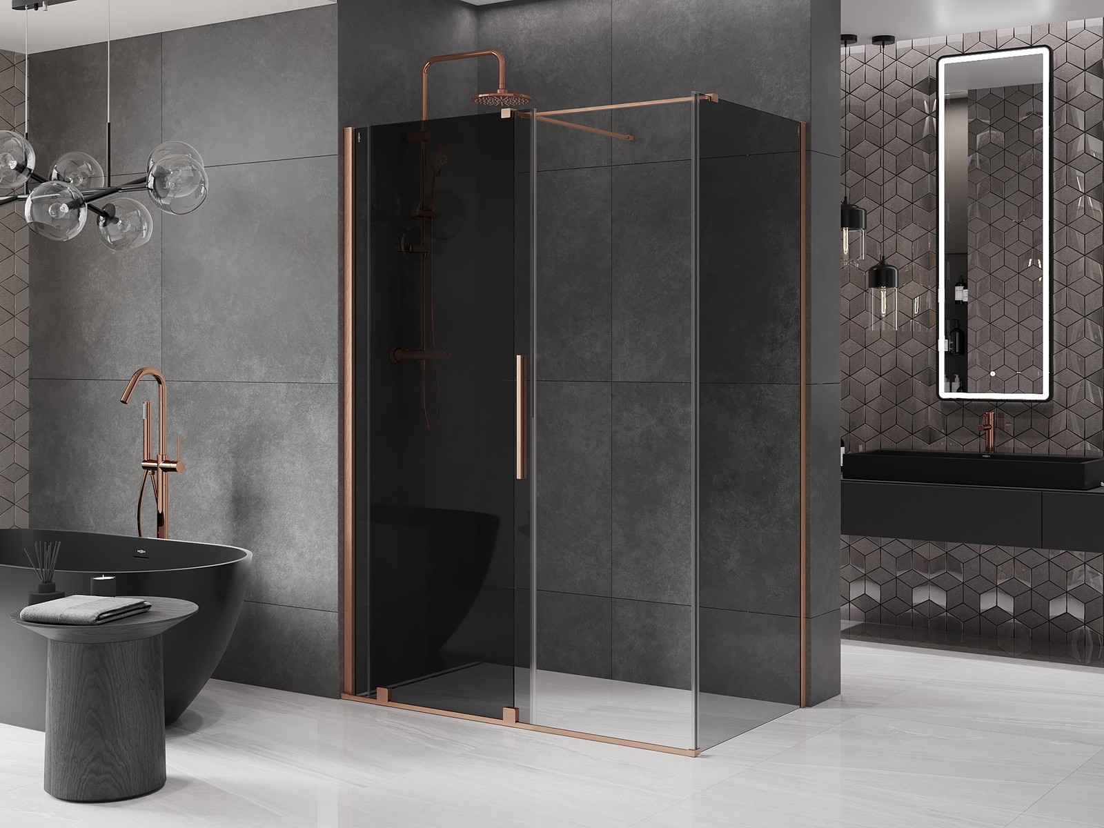 Mexen Velar je posuvná sprchová kabina o rozměrech 150 x 75 cm, která spojuje moderní design s funkčností. Vyrobena z tvrzeného skla o tloušťce 8 mm v grafitové barvě, s elegantním kartáčovaným měděným povrchem. Univerzální montáž umožňuje instalaci na vaničku nebo dlaždice a možnost regulace šířky a vyrovnání nerovností stěny zajišťuje dokonalé přizpůsobení. Díky povlaku ulehčujícímu čištění a nejvyšší kvalitě koleček se používání stává pohodlným a bezproblémovým.