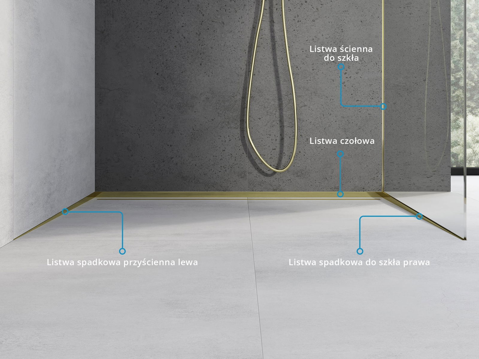 Čelní profil je doplňkem při použití zkosených profilů, vytváří jednotný celek v prostorách sprchy