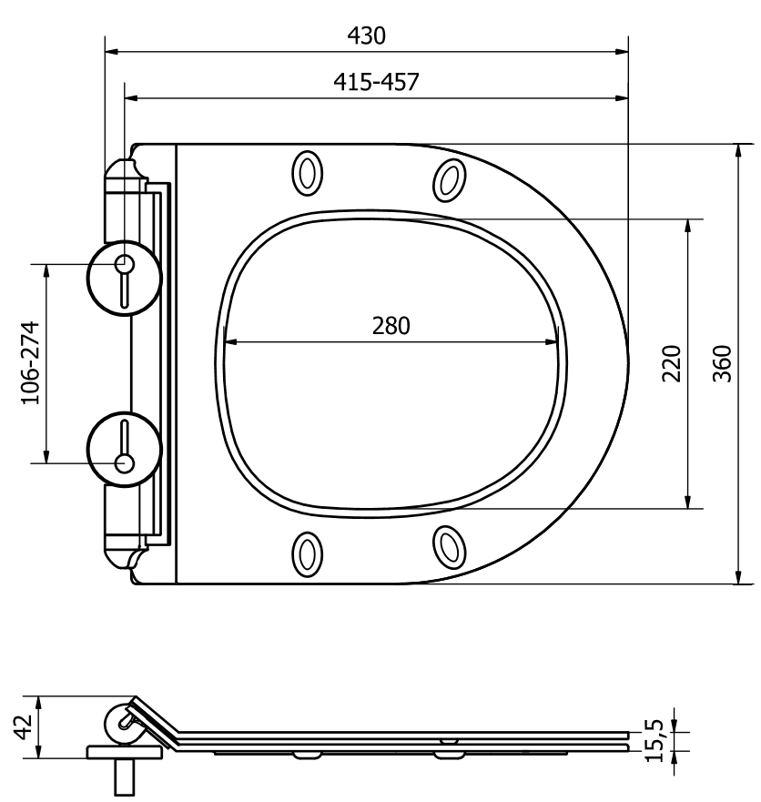 V kompletu jsou pevné kovové závěsy, které zaručují stabilní uchycení prkénka k WC míse. Je to praktické řešení, které umožňuje snadné přizpůsobení prkénka tvaru a rozměrům toalety, zajišťující pohodlí při používání.