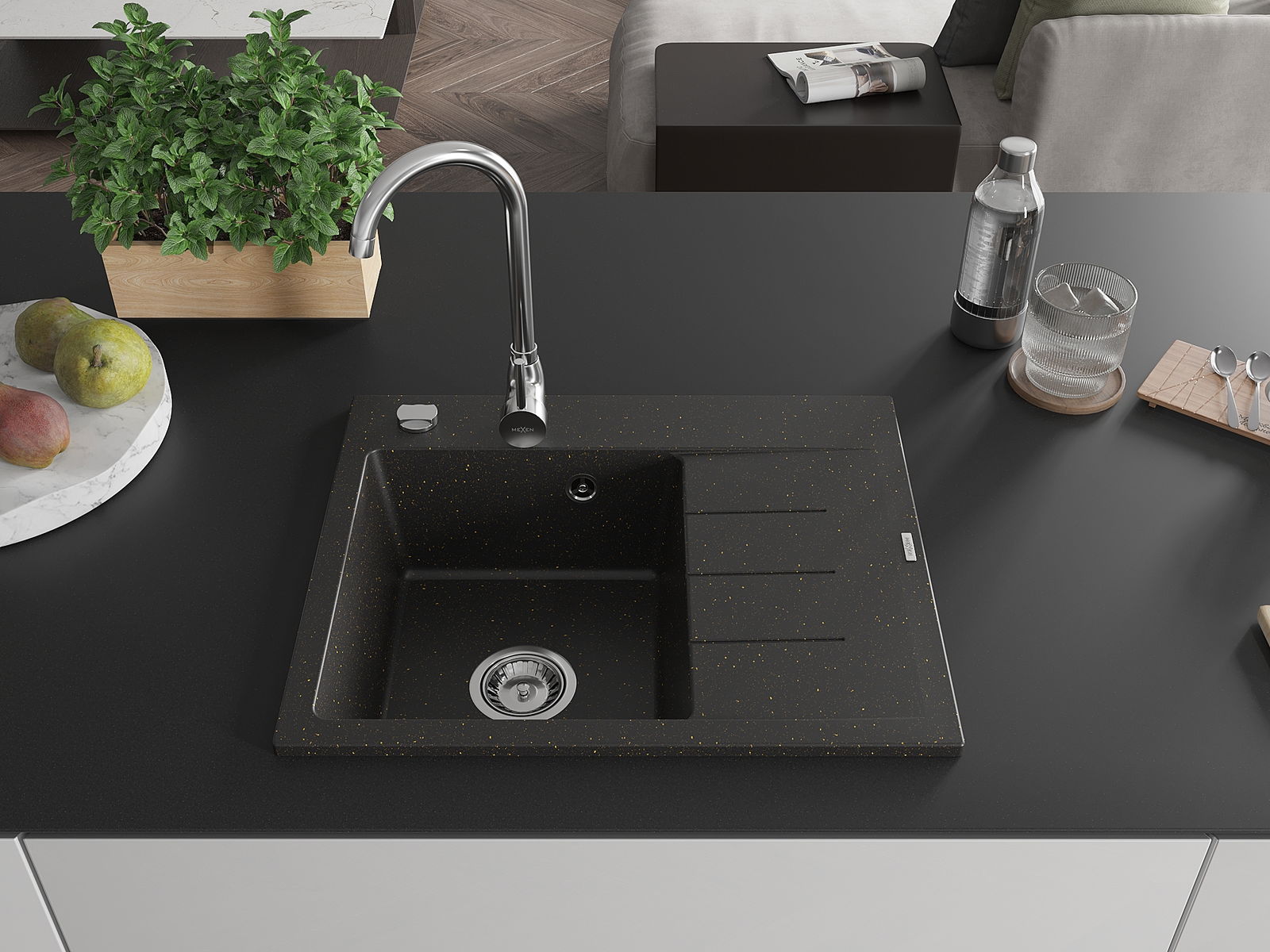 Mexen Ben granitový kuchyňský dřez s jednou komorou a odkapávací plochou, levý 600 x 500 mm, černý/zlatý metalický,