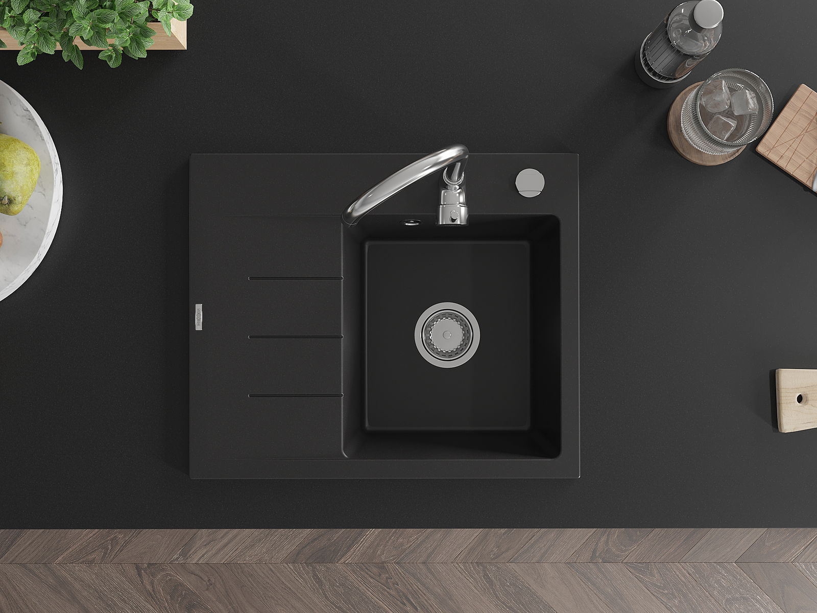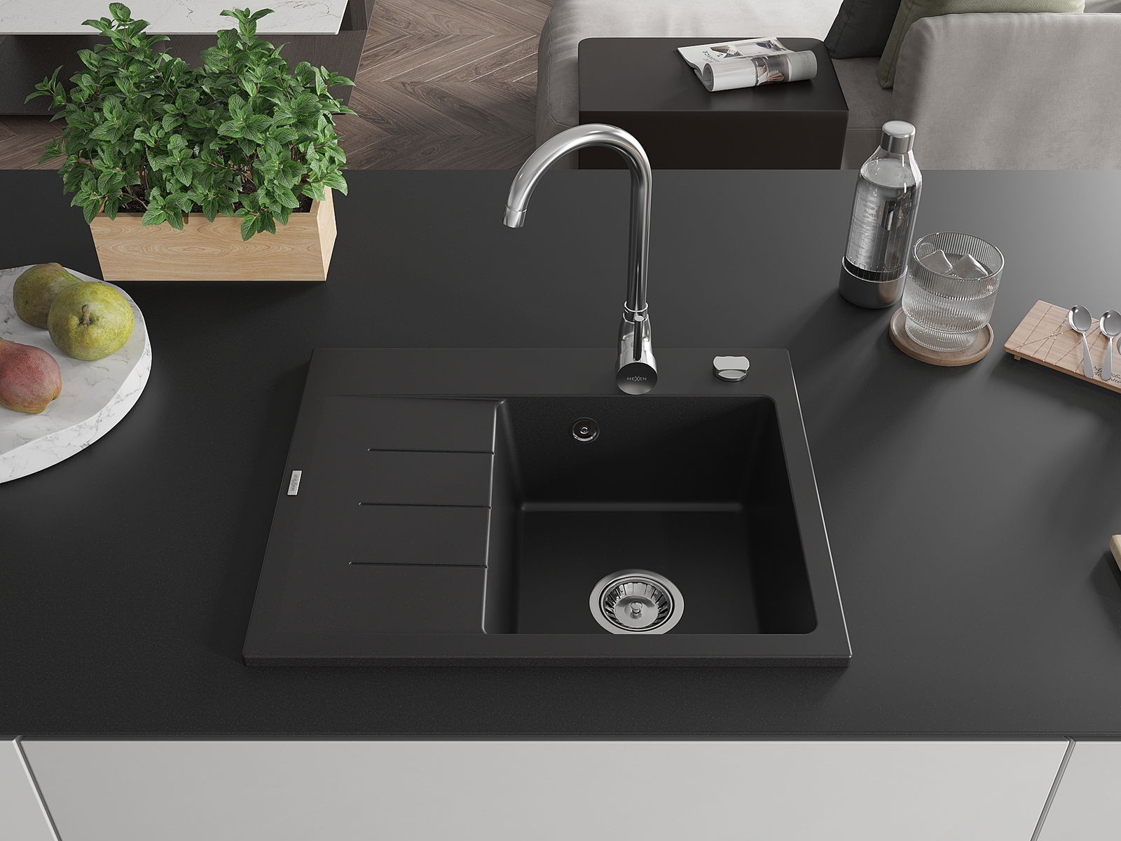 Mexen Ben granitový dřez 1-komorový s odkapávačem, pravý 600 x 500 mm, černý, chromový sifon - 6523605000-77