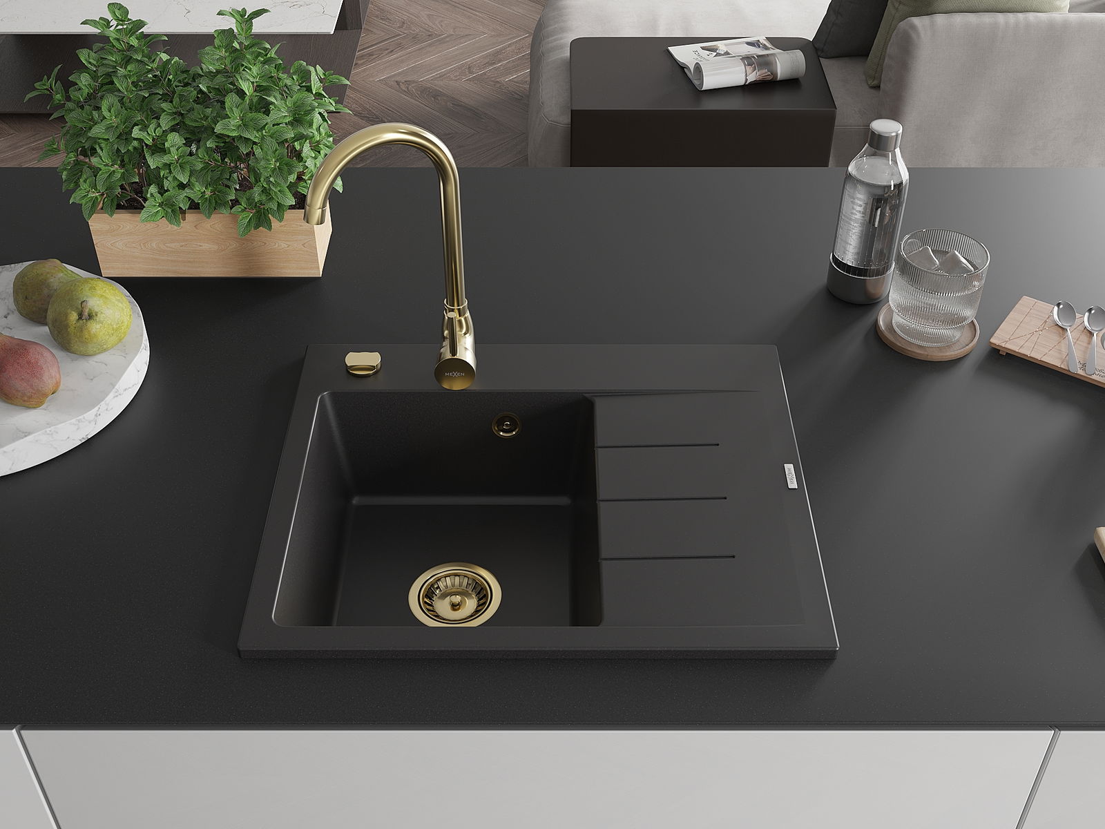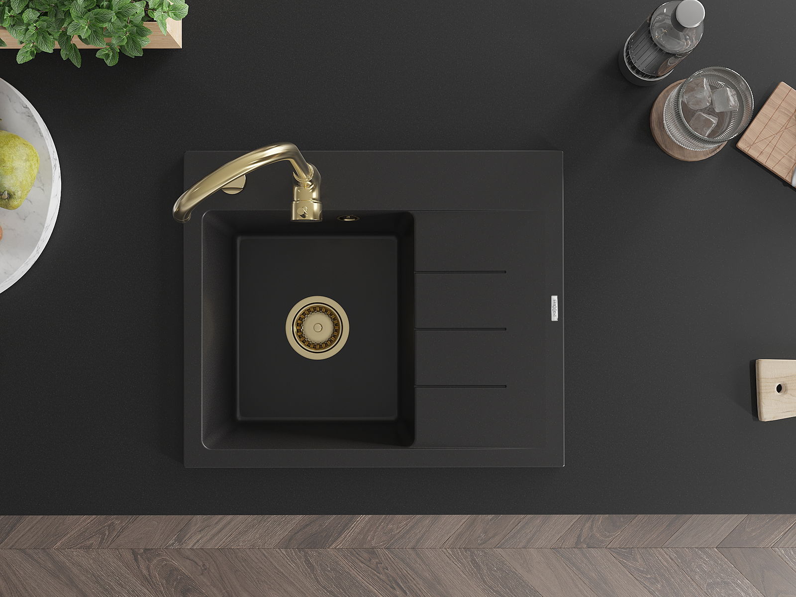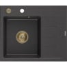 Mexen Ben granitový dřez 1-komorový s odkapávačem, levý 600 x 500 mm, černý, sifon zlatý - 6522605000-77-G