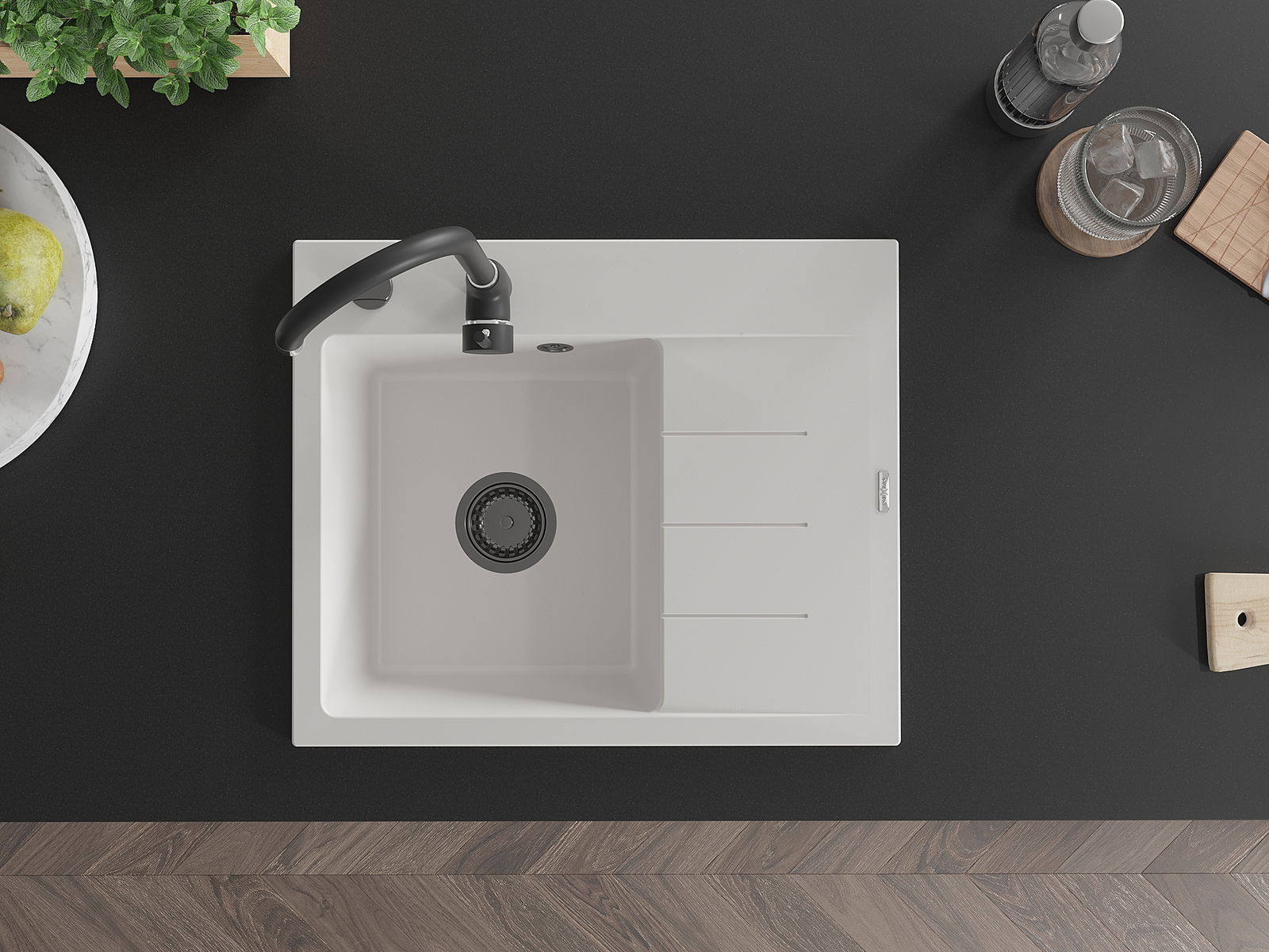Mexen Ben granitový dřez s 1 komorou a odkapávačem, levý 600 x 500 mm, bílý, černý sifon - 6522605000-20-B