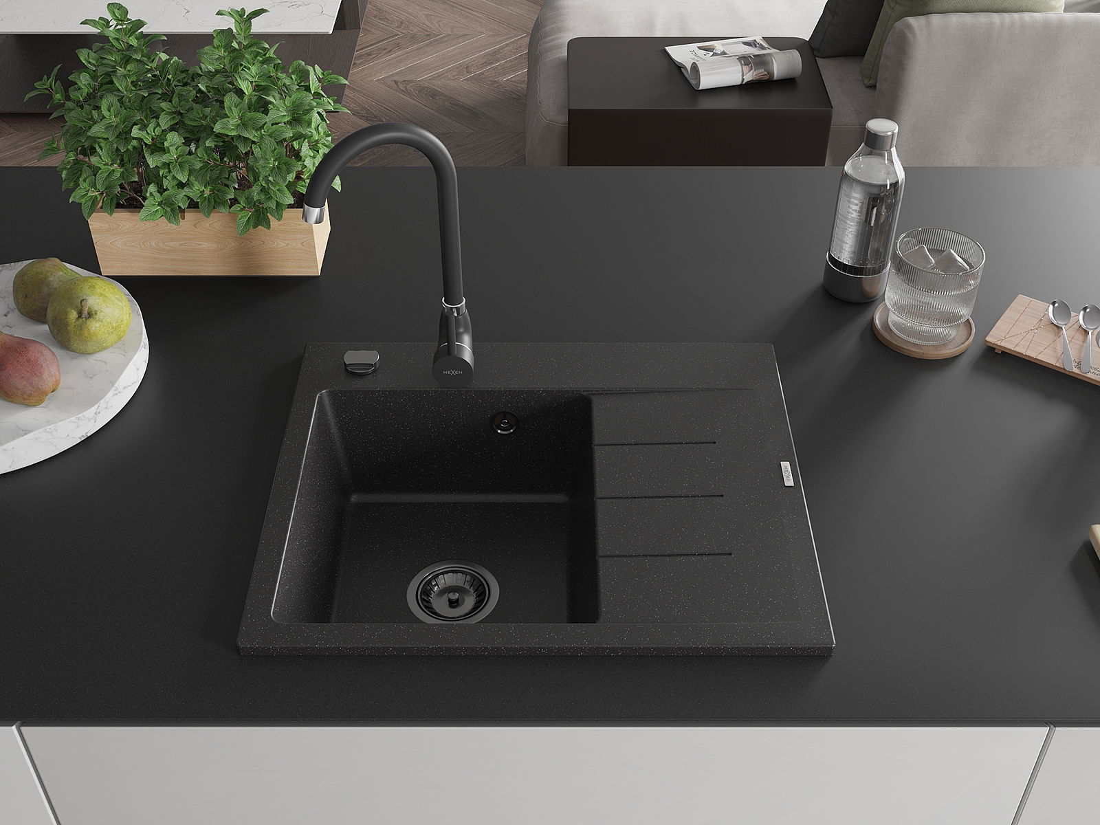 Mexen Ben granitový dřez s 1 komorou a odkapávačem, levý 600 x 500 mm černý/stříbrný metalický sifon černý