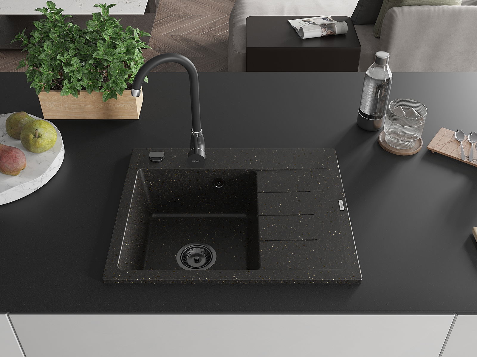Mexen Ben granitový dřez s odkapávačem, levý 600 x 500 mm, černý/zlatý metalik, černý sifon - 6522605000-75-B
