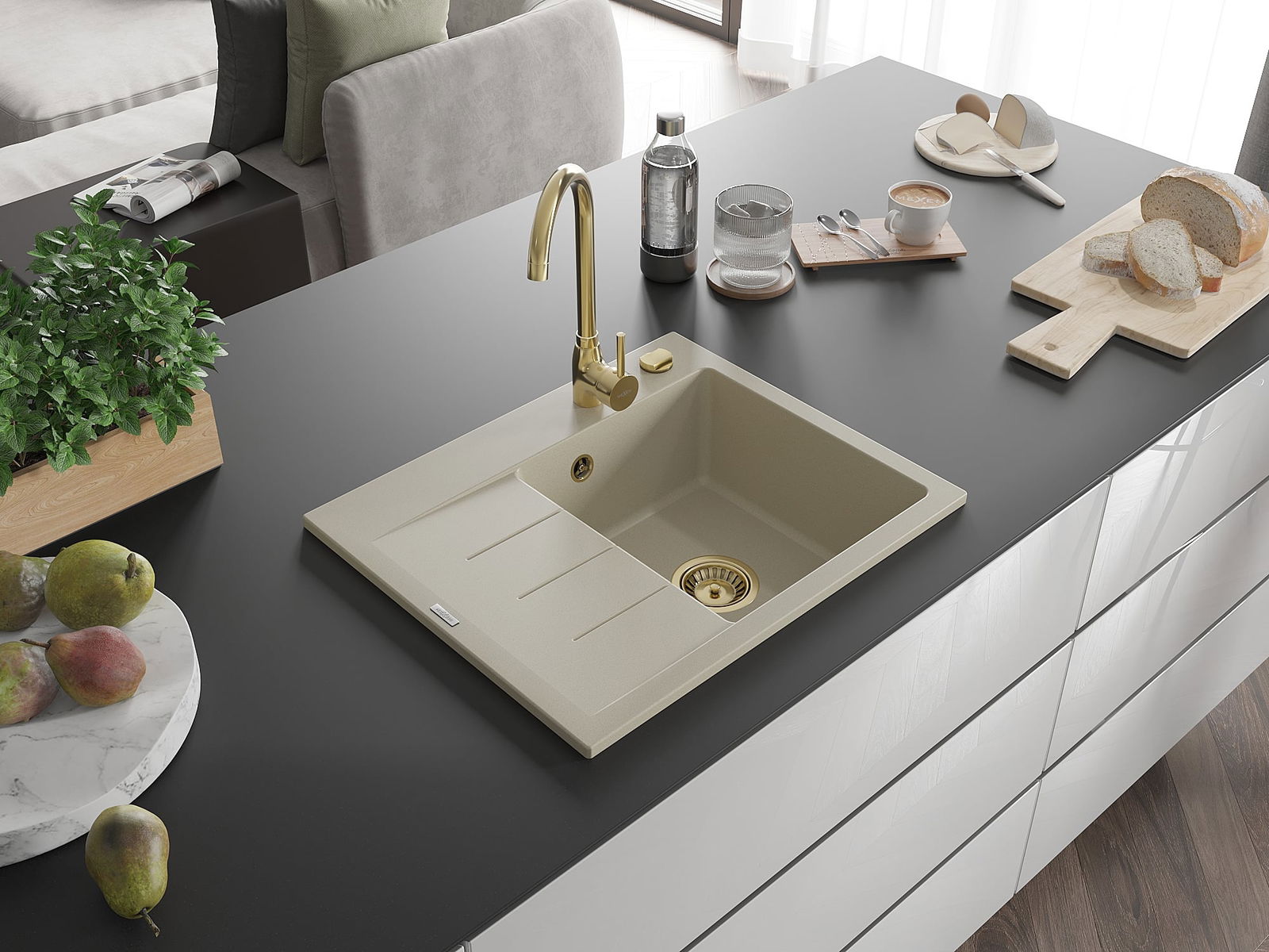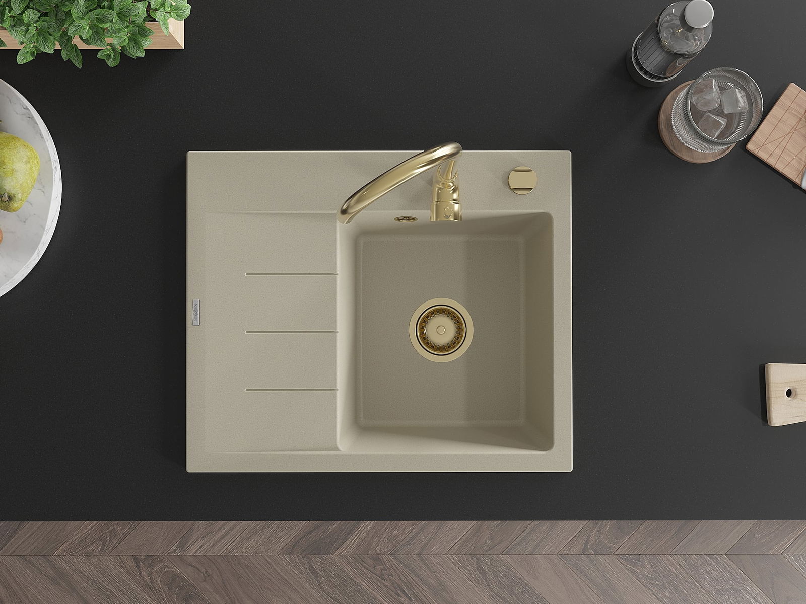 Mexen Ben granitový dřez s odkapávačem, pravý 600 x 500 mm, béžový, zlatý sifon - 6523605000-69-G