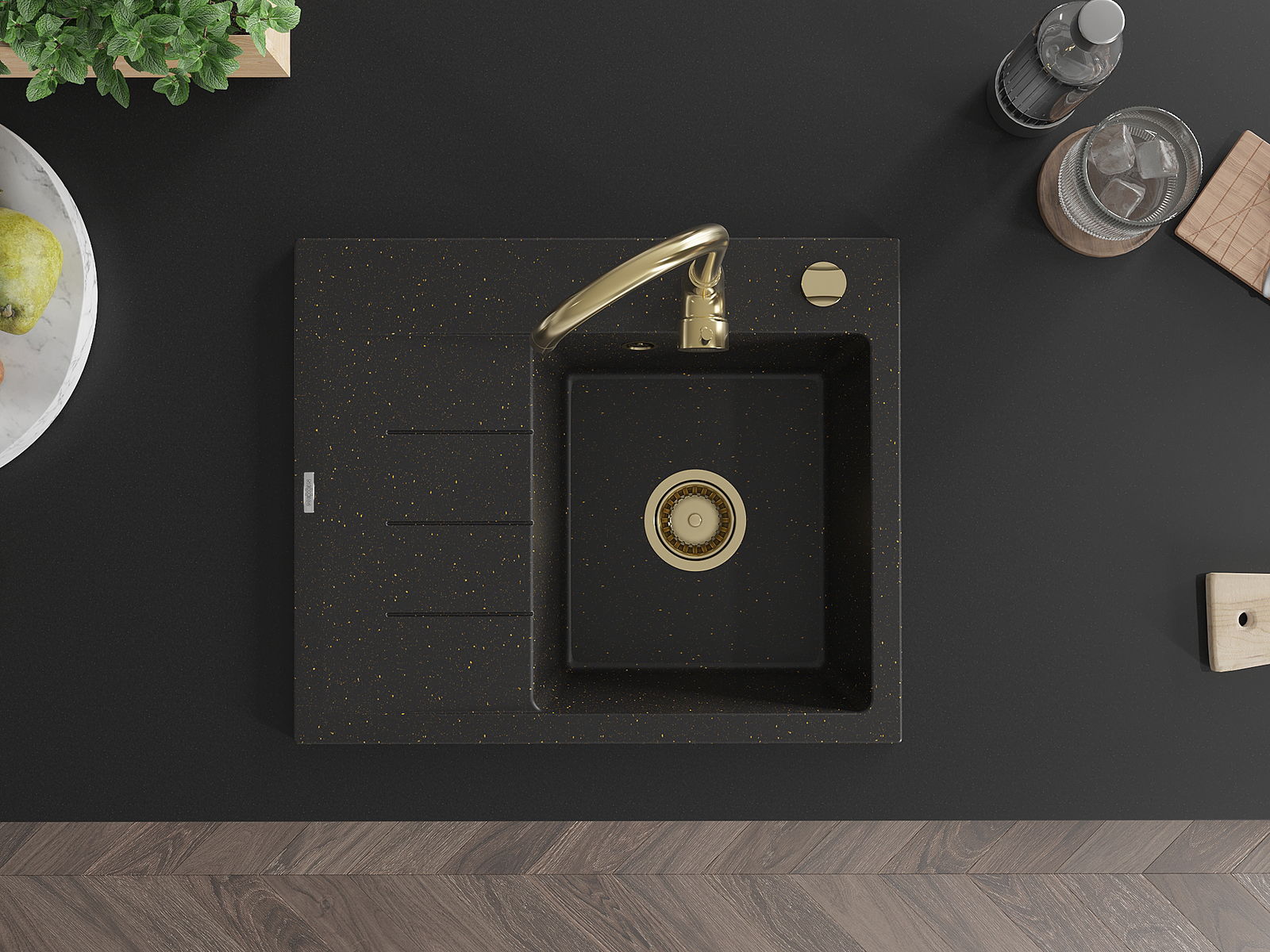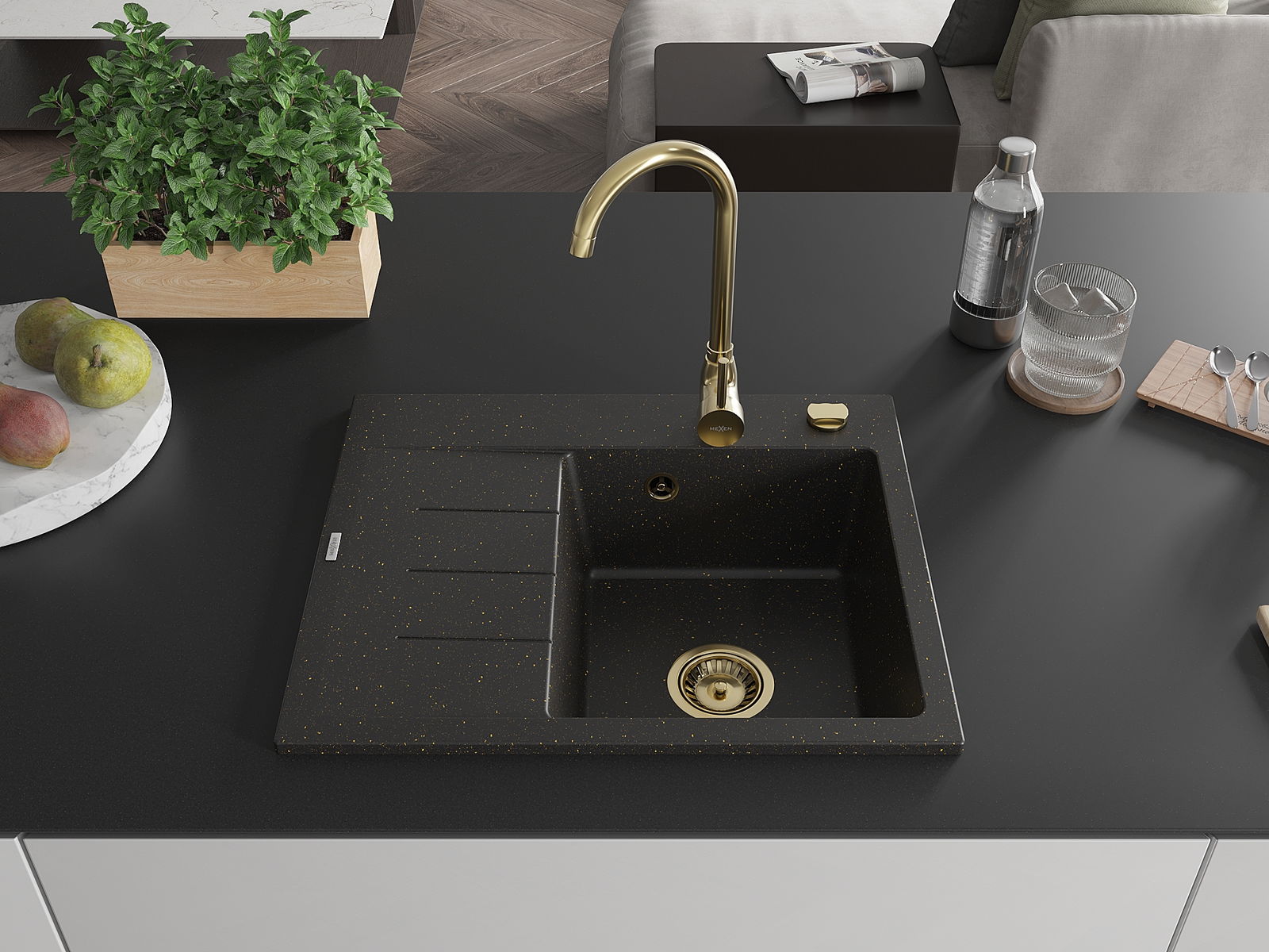 Mexen Ben granitový dřez 1-komorový s odkapávačem, pravý 600 x 500 mm, černý/zlatý metalik, sifon zlatý