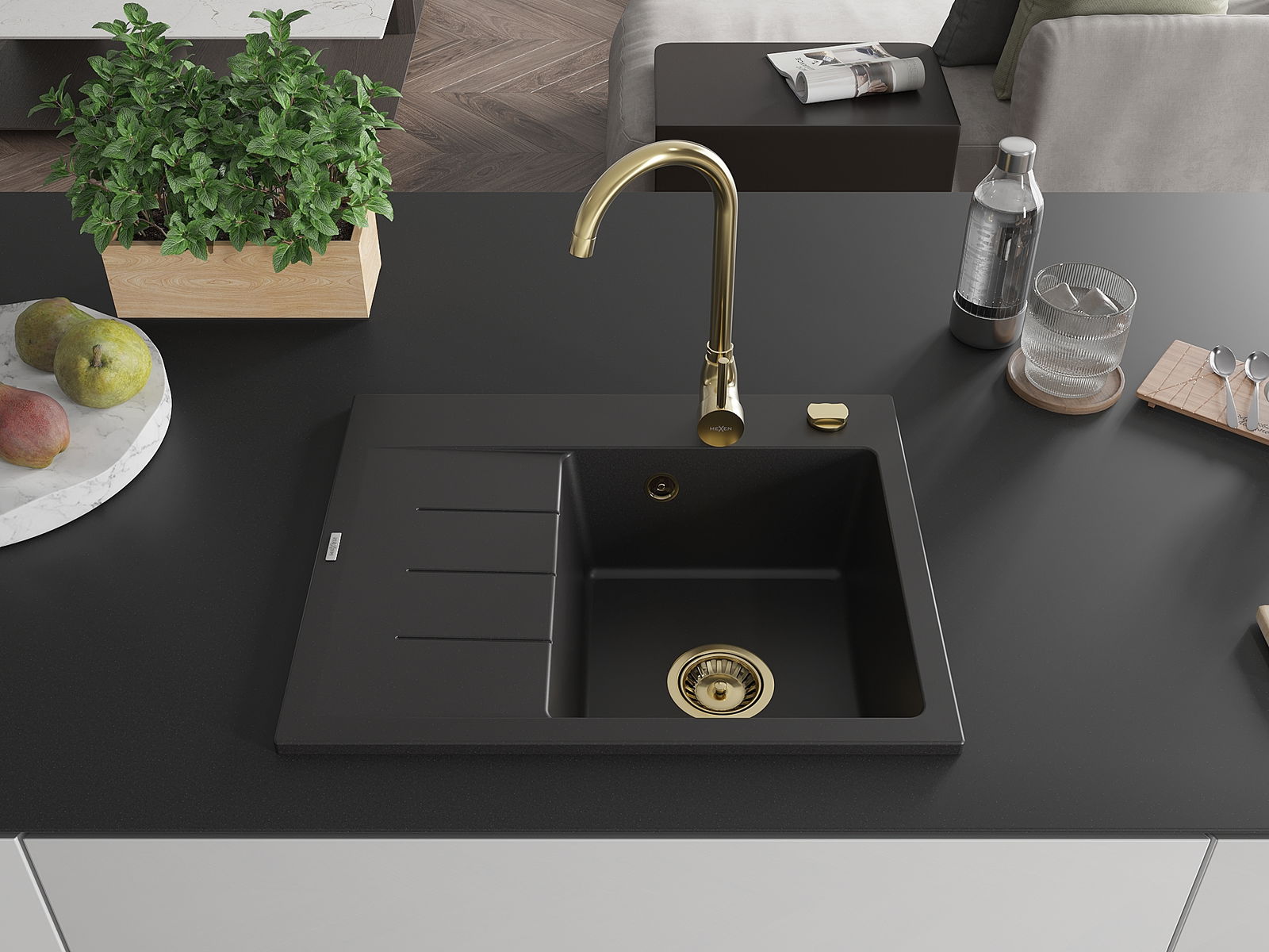 Mexen Ben granitový dřez s jednou komorou a odkapávačem, pravý 600 x 500 mm, černý, zlatý sifon - 6523605000-77-G