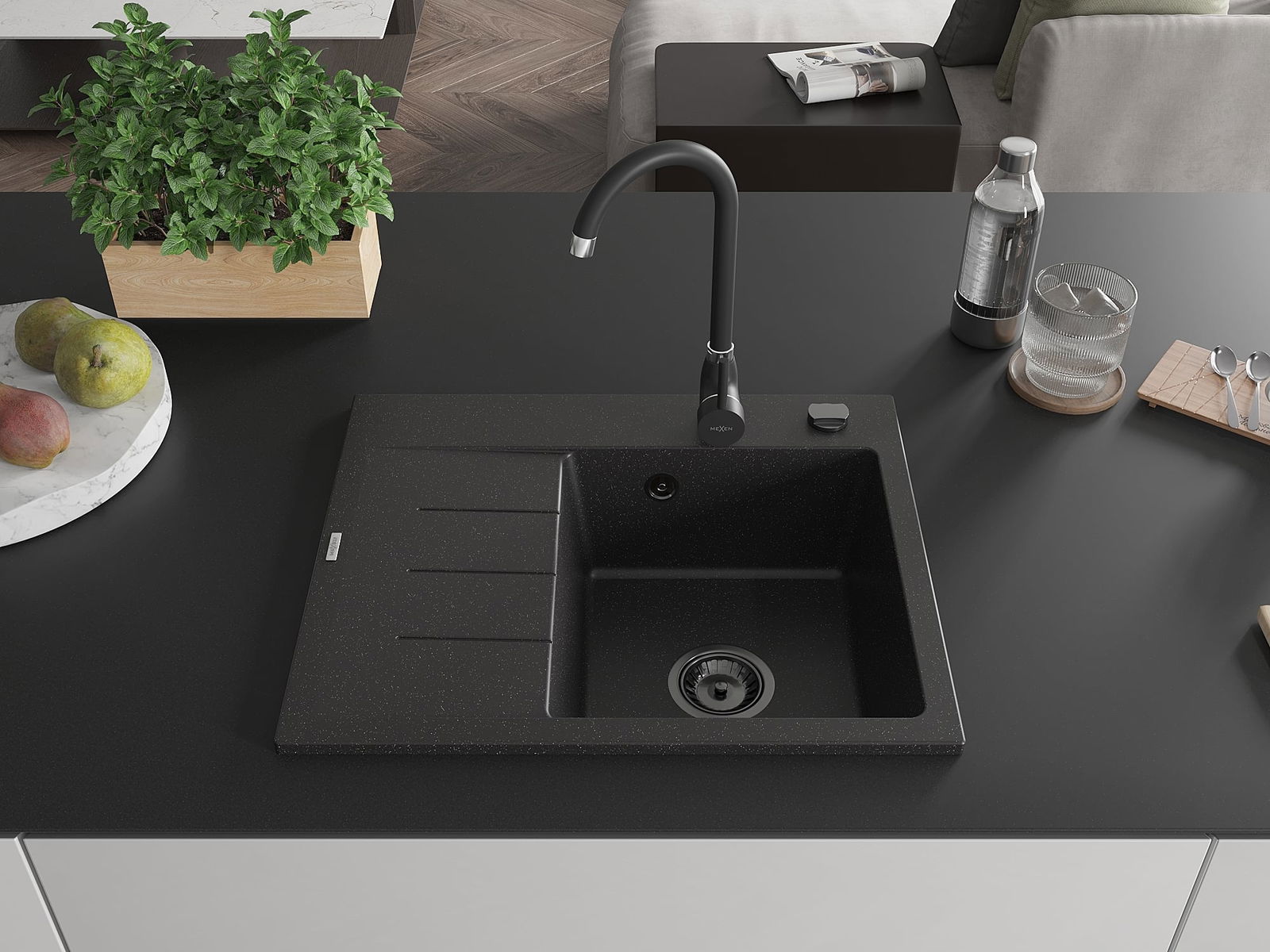 Mexen Ben granitový dřez s 1 komorou a odkapávačem, pravý 600x500 mm, černý/stříbrný metalický sifon černý