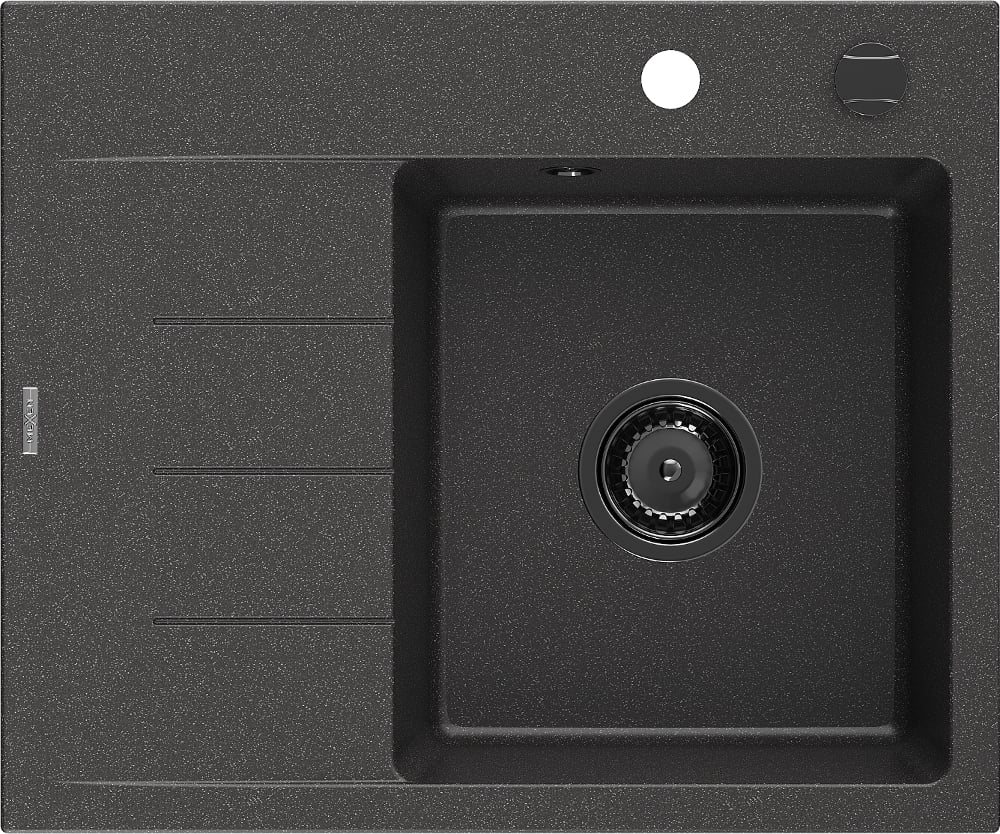 Mexen Ben granitový dřez s jednou vaničkou a odkapávačem, pravý 600 x 500 mm, černý se skvrnami, černý sifon