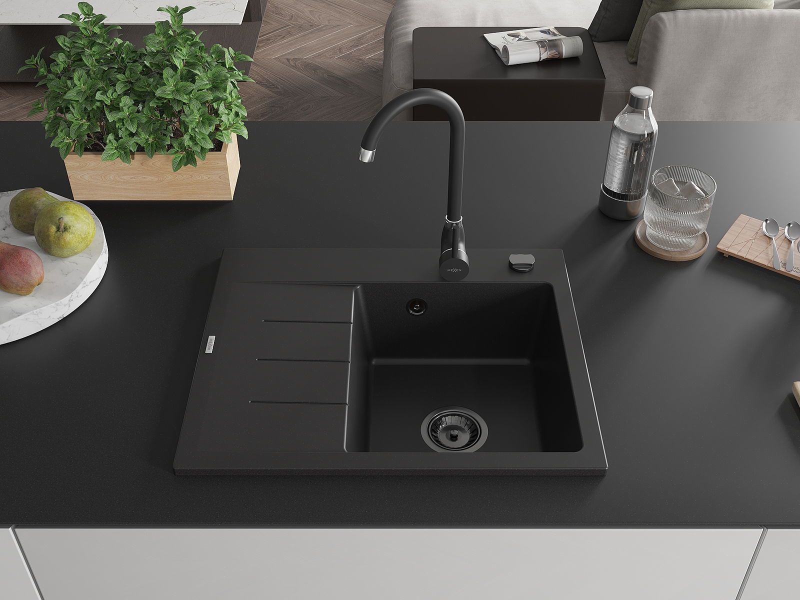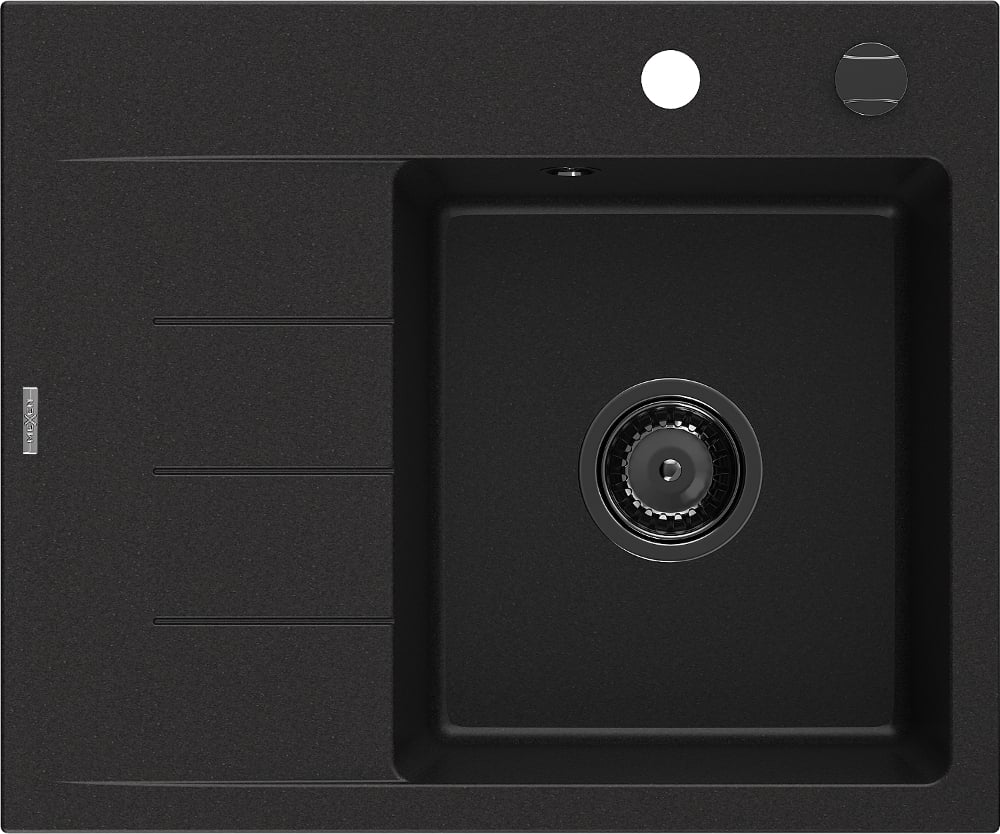 Mexen Ben granitový dřez s odkapávačem, pravý 600 x 500 mm, černý, černý sifon - 6523605000-77-B