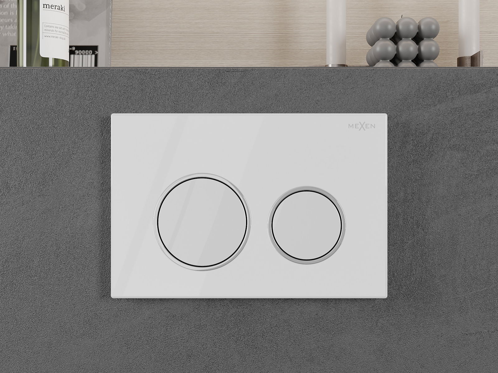 Tlačítko je určeno pro rámy Mexen ze série XS. Může být montováno jak zepředu, tak i shora rámu, což zvyšuje jeho univerzálnost. Takové řešení usnadňuje instalaci v různých montážních podmínkách. Díky tomu je obsluha splachování pohodlná a intuitivní.