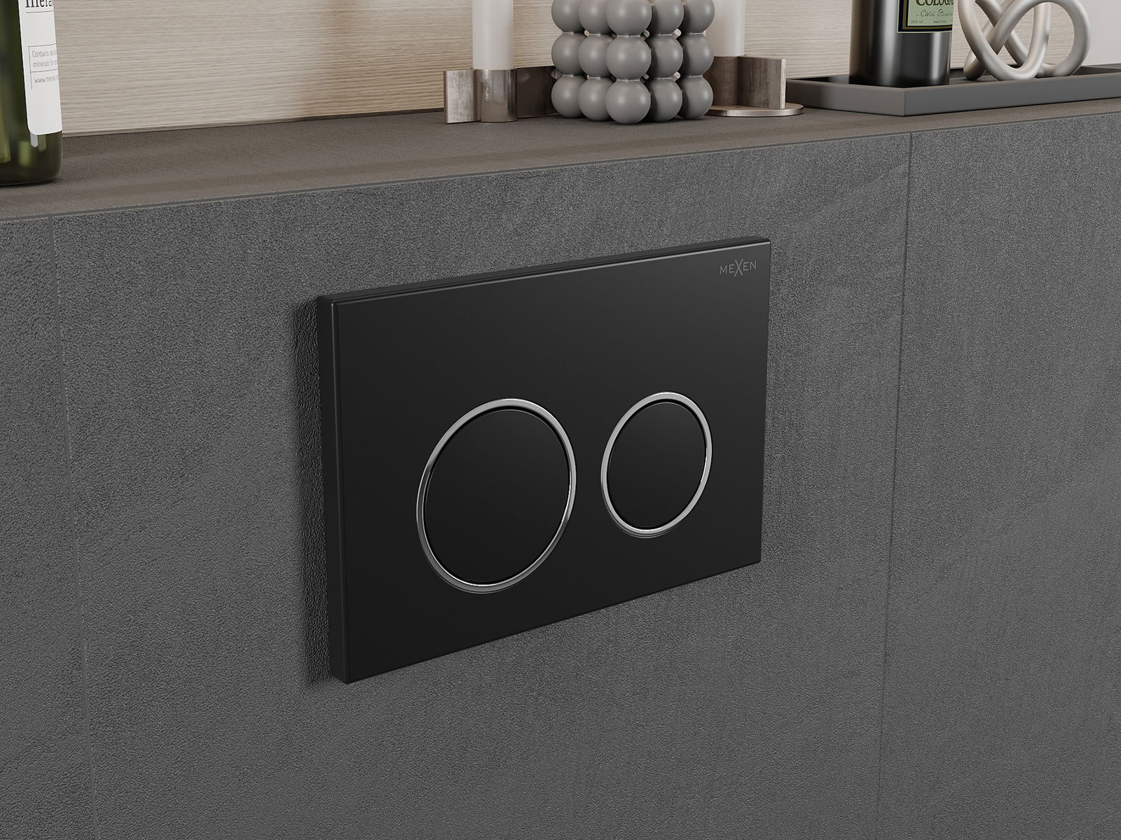 Tlačítko je určeno pro rámy Mexen ze série XS. Může být montováno jak zepředu, tak i shora rámu, což zvyšuje jeho univerzálnost. Takové řešení usnadňuje instalaci v různých montážních podmínkách. Díky tomu je obsluha splachování pohodlná a intuitivní.