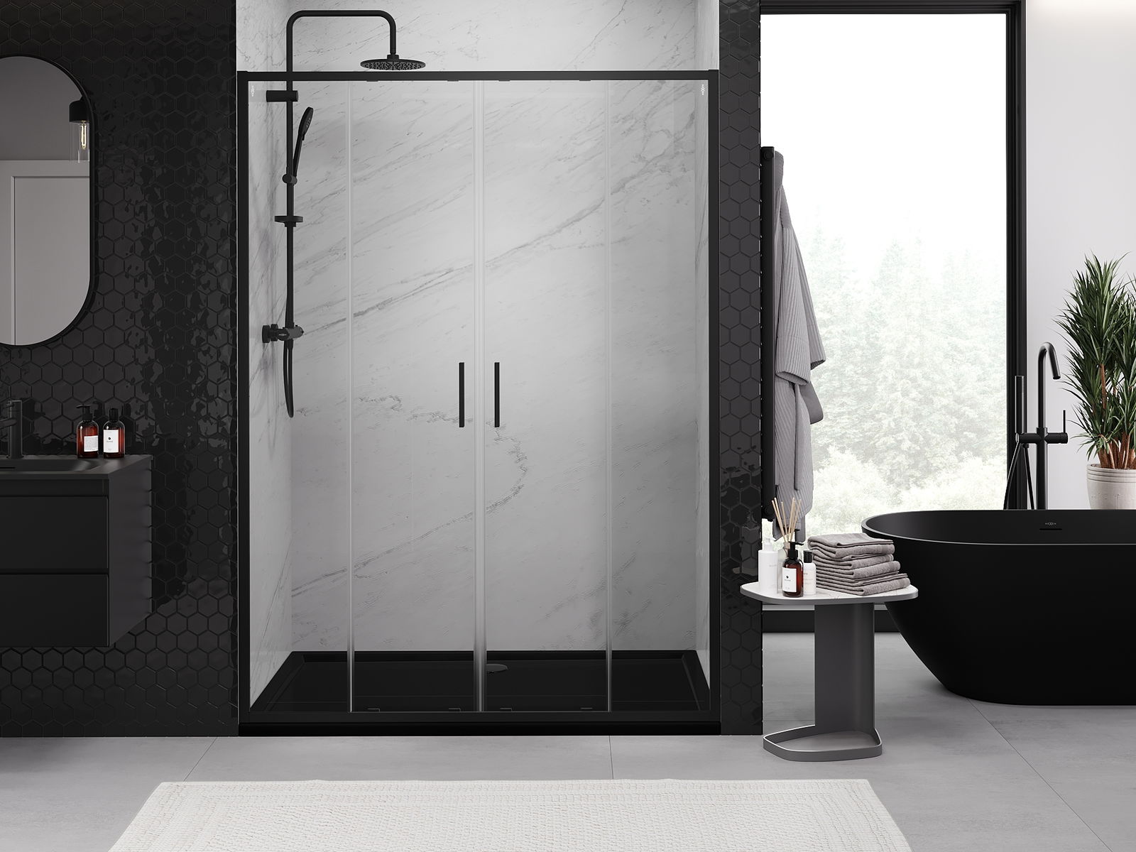 Praktická a pohodlná rukojeť je vyrobena z odolného a trvanlivého kovu. Moderní tvar ve spojení s povrchovou úpravou, která ladí s barvou profilů, dodává celku moderní a stylový vzhled, zdůrazňující estetiku každé koupelny.