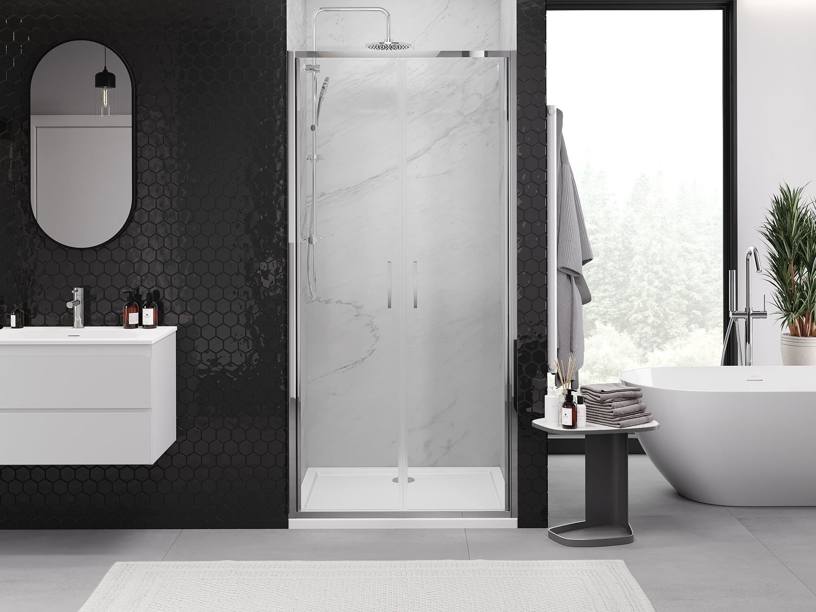 Díky použití univerzálního montážního systému mohou být sprchové dveře namontovány na pravé nebo levé straně, podle potřeby. Díky tomu můžete snadno navrhnout sprchu přizpůsobenou prostoru koupelny.