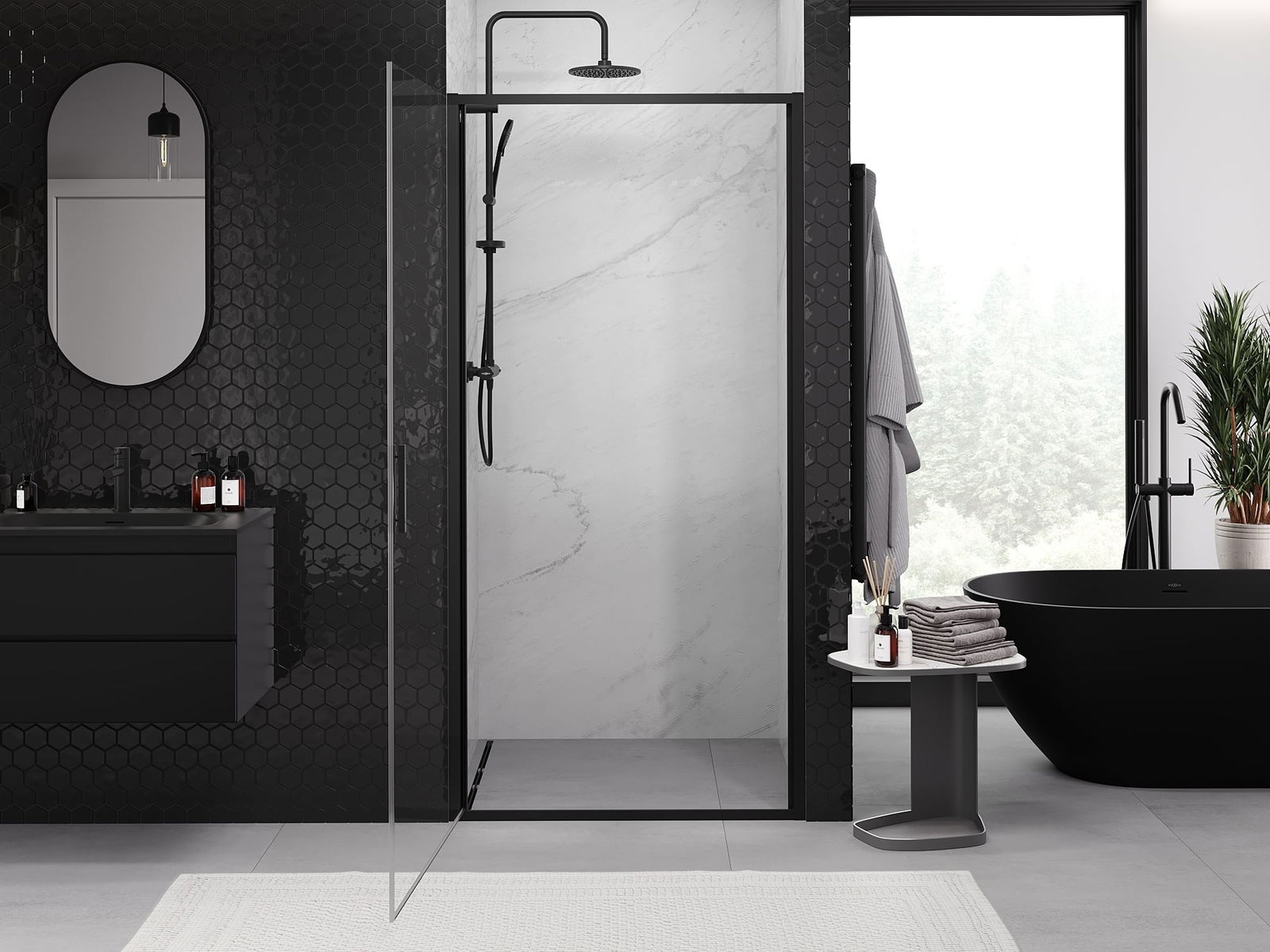Praktická a pohodlná rukojeť je vyrobena z odolného a trvanlivého kovu. Moderní tvar ve spojení s povrchovou úpravou, která ladí s barvou profilů, dodává celku moderní a stylový vzhled, zdůrazňující estetiku každé koupelny.