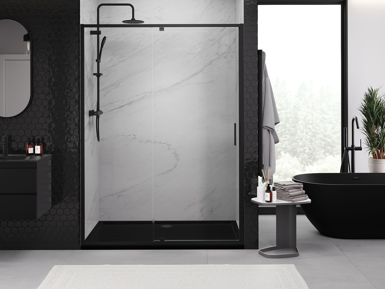 Praktická a pohodlná rukojeť je vyrobena z odolného a trvanlivého kovu. Moderní tvar ve spojení s povrchovou úpravou, která ladí s barvou profilů, dodává celku moderní a stylový vzhled, zdůrazňující estetiku každé koupelny.