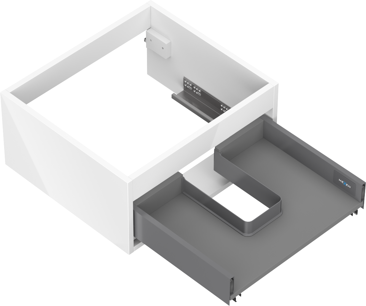 Výřez v zásuvce je navržen tak, aby pojmul sifon, který je nezbytný v instalacích umyvadlových. Díky tomu může být nábytek plně funkčně namontován, aniž by bylo nutné vzdát se prostoru v zásuvce ve prospěch instalace.
