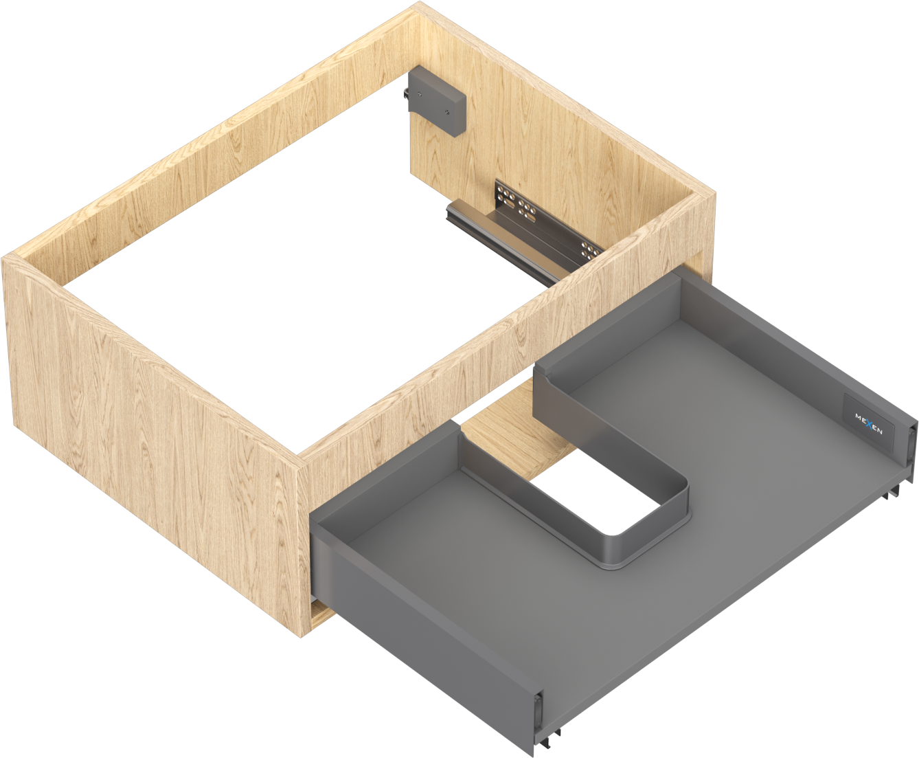 Výřez v zásuvce je navržen tak, aby pojmul sifon, který je nezbytný v instalacích umyvadlových. Díky tomu může být nábytek plně funkčně namontován, aniž by bylo nutné vzdát se prostoru v zásuvce ve prospěch instalace.
