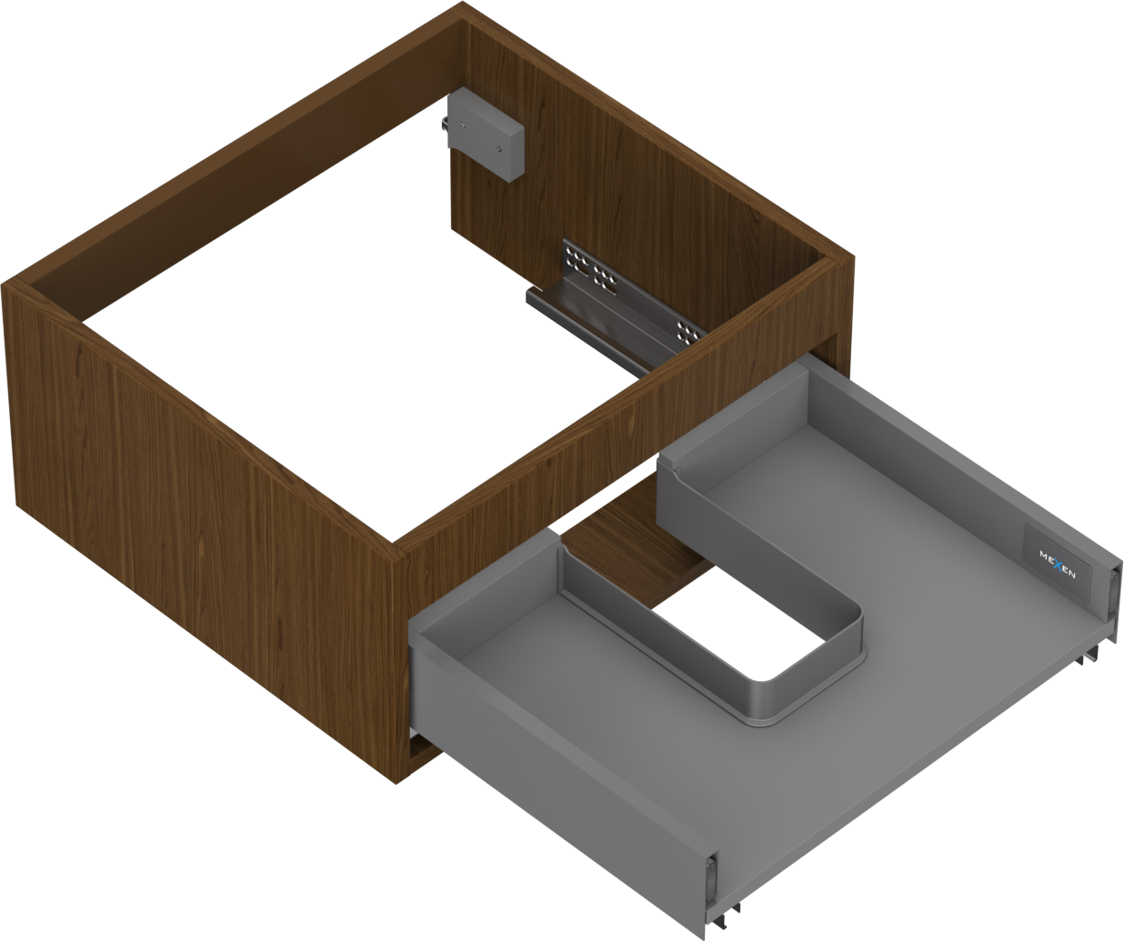 Výřez v zásuvce je navržen tak, aby pojmul sifon, který je nezbytný v instalacích umyvadlových. Díky tomu může být nábytek plně funkčně namontován, aniž by bylo nutné vzdát se prostoru v zásuvce ve prospěch instalace.