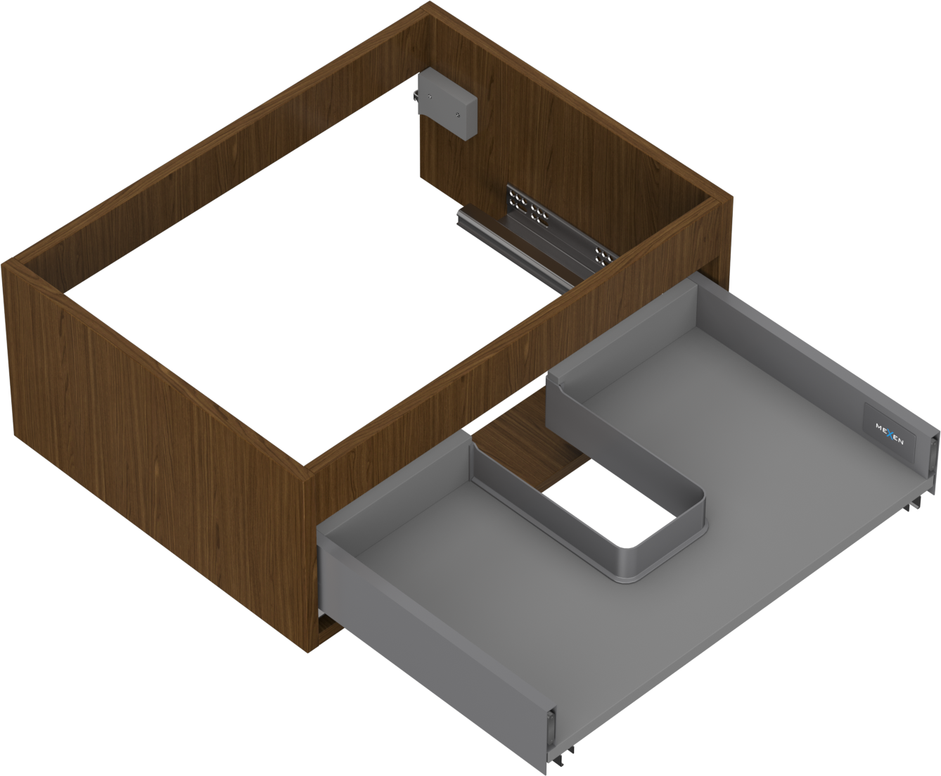 Výřez v zásuvce je navržen tak, aby pojmul sifon, který je nezbytný v instalacích umyvadlových. Díky tomu může být nábytek plně funkčně namontován, aniž by bylo nutné vzdát se prostoru v zásuvce ve prospěch instalace.