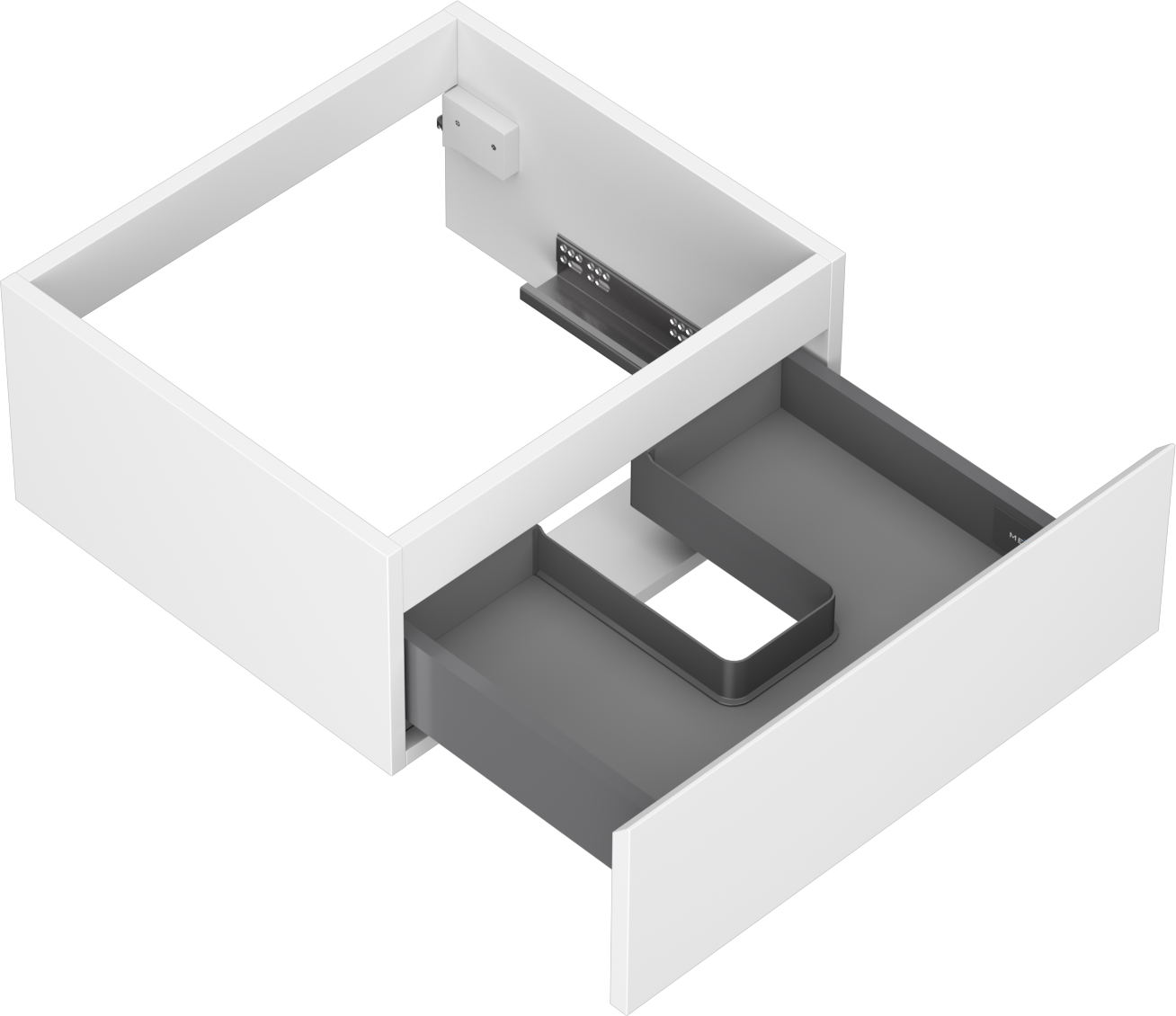 Výřez v zásuvce je navržen tak, aby pojmul sifon, který je nezbytný v instalacích umyvadlových. Díky tomu může být nábytek plně funkčně namontován, aniž by bylo nutné vzdát se prostoru v zásuvce ve prospěch instalace.