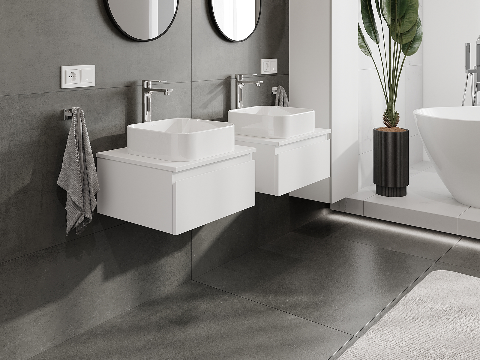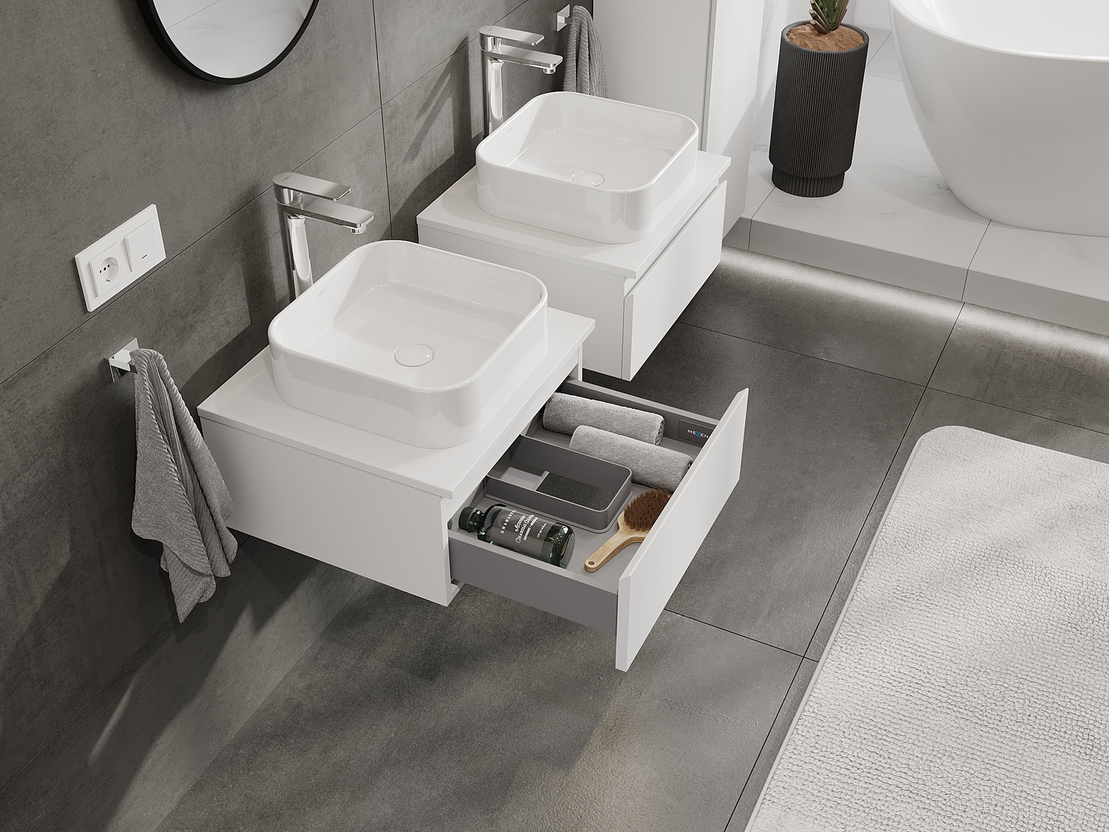 Naše modulární koupelnový nábytek lze kombinovat v různých barevných konfiguracích, což umožňuje plnou personalizaci. Můžete si vybrat jak vzhled, tak funkce jednotlivých prvků, což umožňuje přizpůsobit nábytek vašim stylovým a uživatelským preferencím.