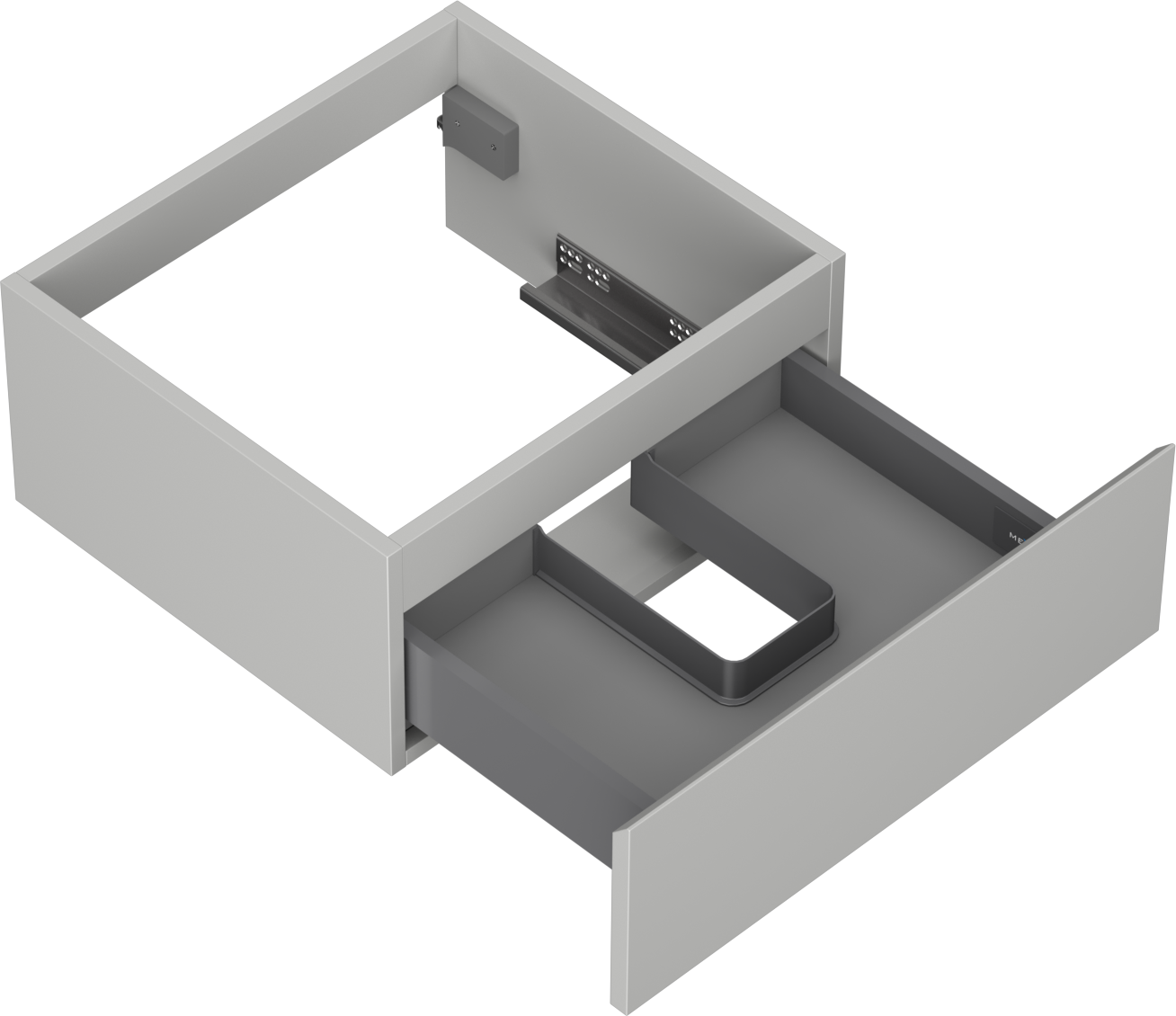 Výřez v zásuvce je navržen tak, aby pojmul sifon, který je nezbytný v instalacích umyvadlových. Díky tomu může být nábytek plně funkčně namontován, aniž by bylo nutné vzdát se prostoru v zásuvce ve prospěch instalace.