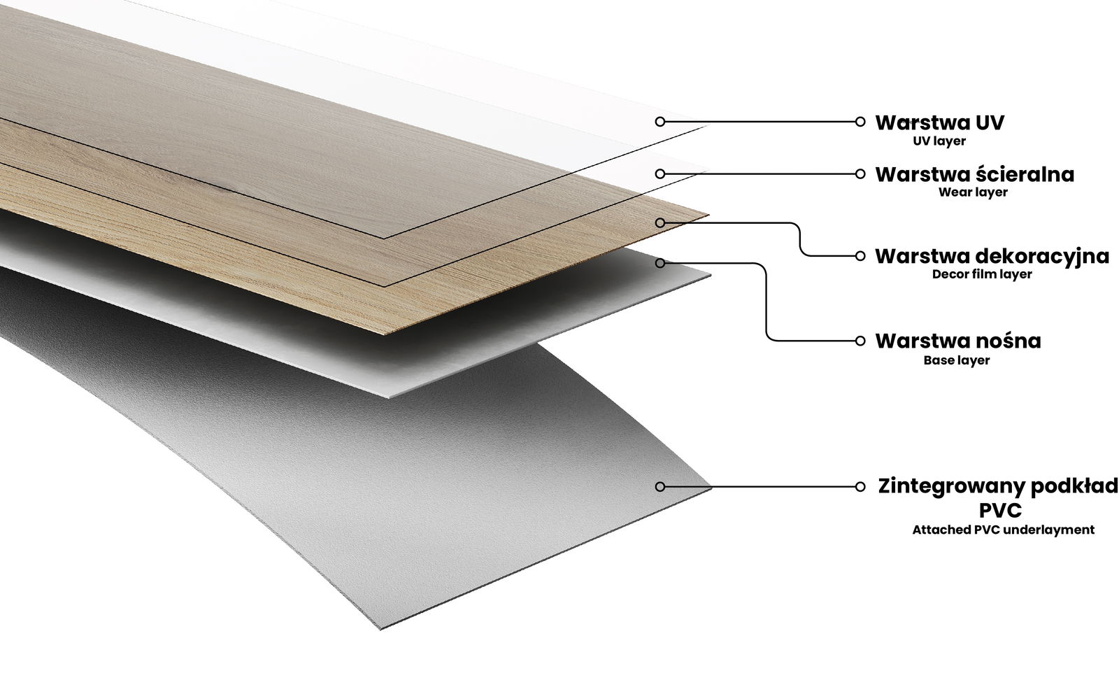 Při pokládání vinylových panelů je třeba pamatovat na použití podkladu, který plní funkci tepelné a akustické izolace a také zajišťuje stabilitu podlahy. Náš produkt má integrovaný podklad - díky tomuto řešení nemusíme na podlaze rozkládat další materiály a položení podlahy je mnohem pohodlnější a rychlejší.