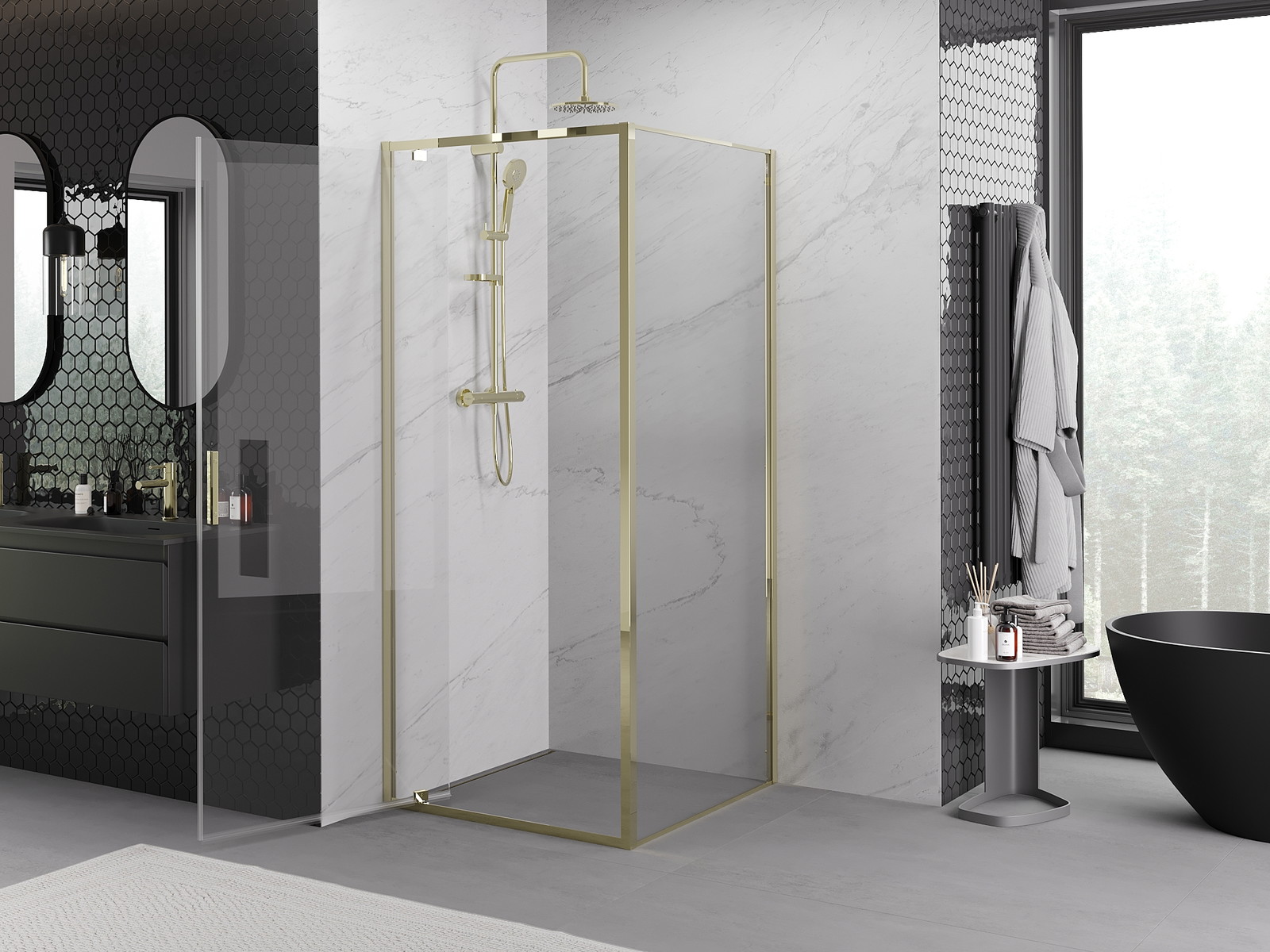 Mexen Exo je elegantní sprchová kabina se sklopnými dveřmi o rozměrech 75x75 cm, ideální pro moderní koupelny. Transparentní tvrzené sklo o tloušťce 6 mm a zlatá povrchová úprava dodávají luxus a lehkost. Možnost univerzální montáže a regulace šířky umožňují dokonalé přizpůsobení. Kabina má vrstvu usnadňující čištění, vyrovnání nerovností stěn a montáž na sprchovou vaničku či dlažbu. Pevná těsnění odvádějí vodu a kovová rukojeť zajišťuje pohodlné užívání.