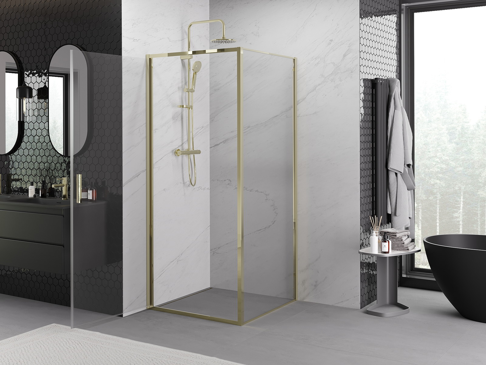 Mexen Exo je elegantní sprchový kout o rozměrech 80x80 cm, který dokonale padne do moderních koupelen. Výška 200 cm a univerzální montáž dělají z tohoto výrobku mimořádně funkční prvek. Křídlové dveře vyrobené z tvrzeného, průhledného skla o tloušťce 6 mm poskytují trvanlivost a bezpečnost. Zlaté vyhotovení dodává luxusní dojem, zatímco hliníkový profil a kovová rukojeť zajišťují stabilitu. Kabina je vybavena povrstvením usnadňujícím čištění a nastavitelnou šířkou, což umožňuje přizpůsobení nerovnostem stěn. Může být instalována jak na vaničku, tak na dlaždice. Sada těsnění a hliníkový dveřní práh zajišťují efektivní odvod vody.