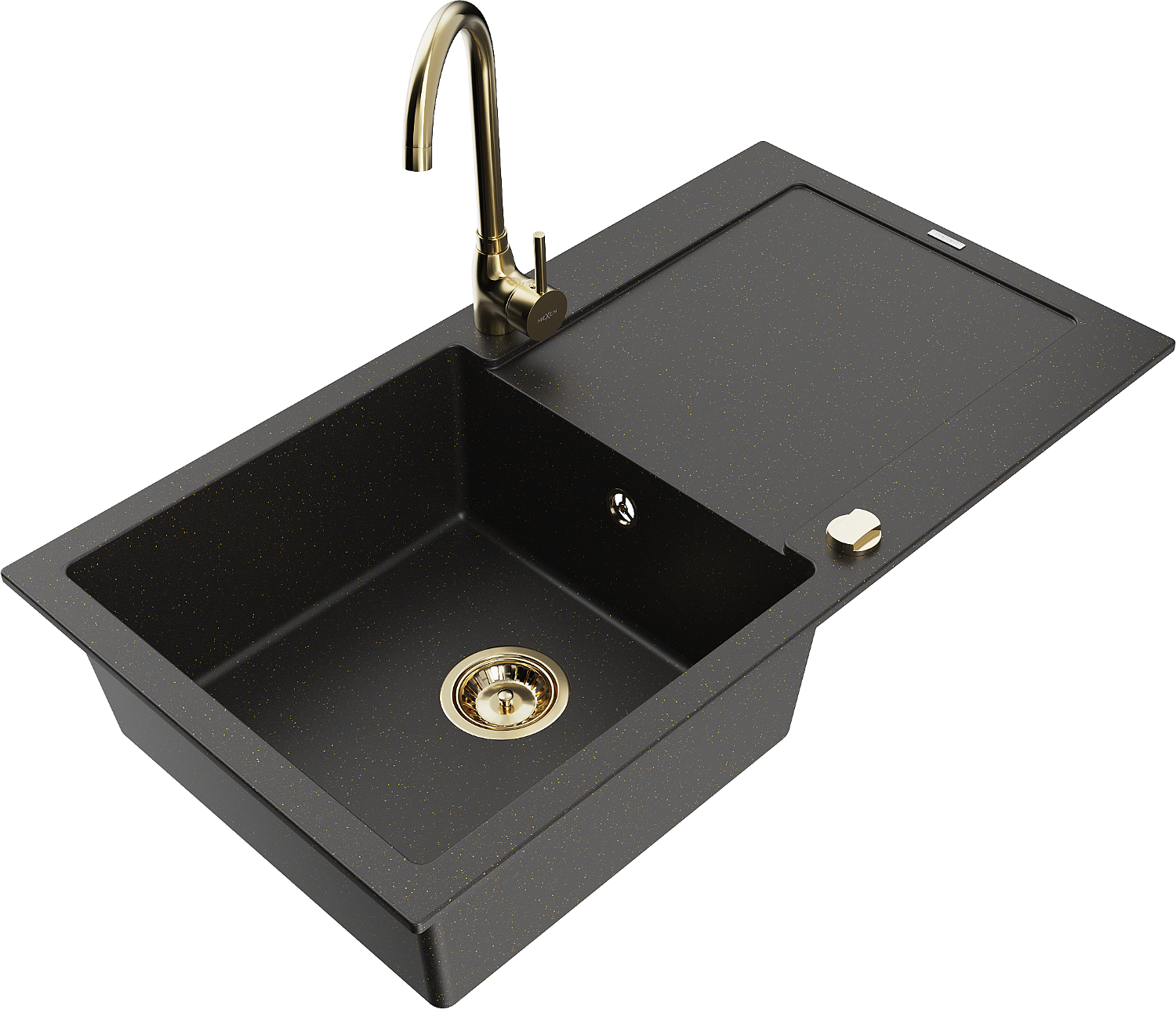 Mexen Leo granitový dřez 1-komorový s odkapávačem a kuchyňskou baterií Telma, černý/zlatý metalik - 6501-75-670200-50