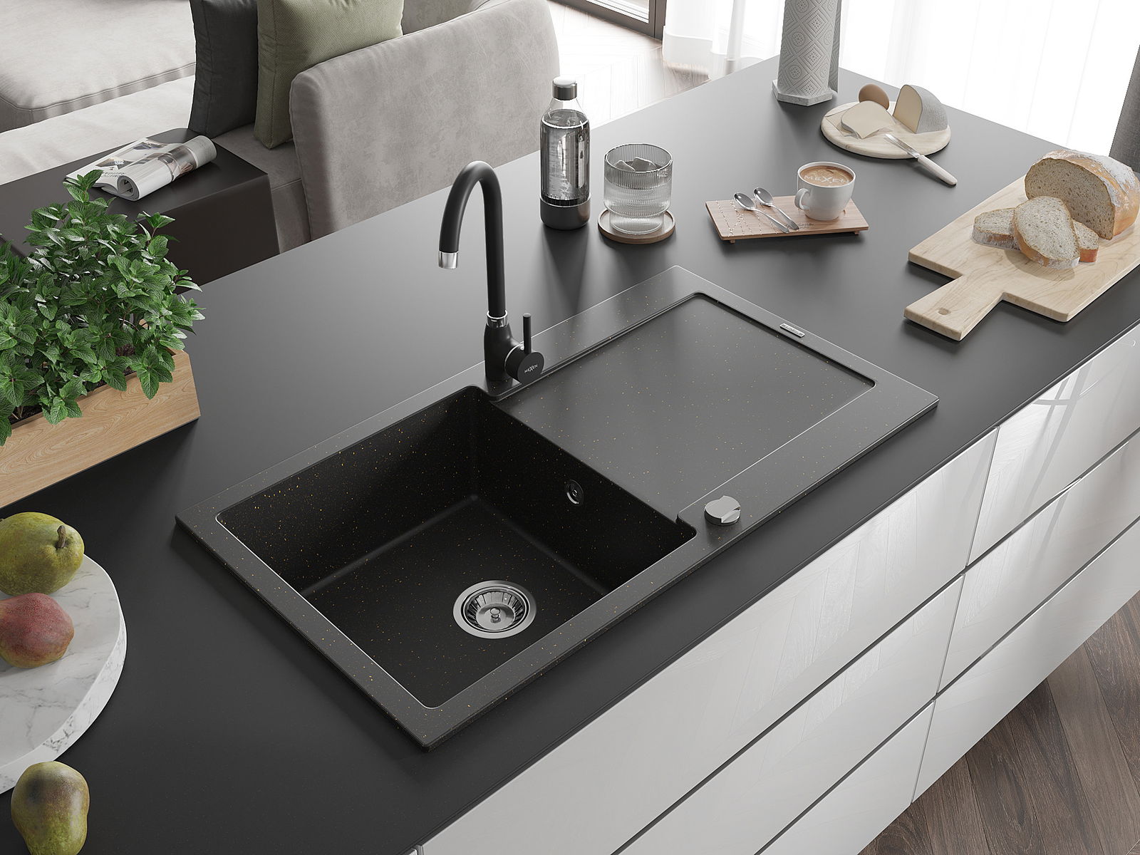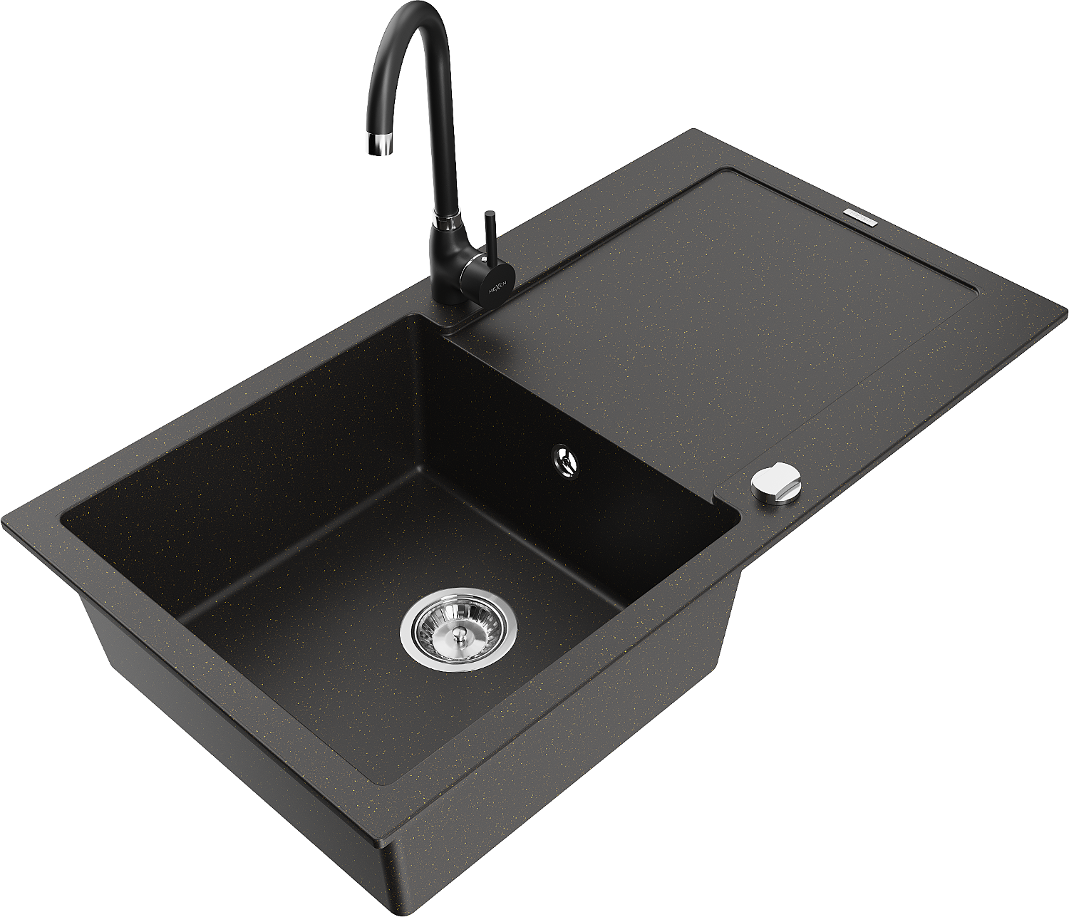 Mexen Leo granitový dřez s 1 komorou a odkapávačem a kuchyňskou baterií Telma, černý/zlatý metalik - 6501-75-670200-70
