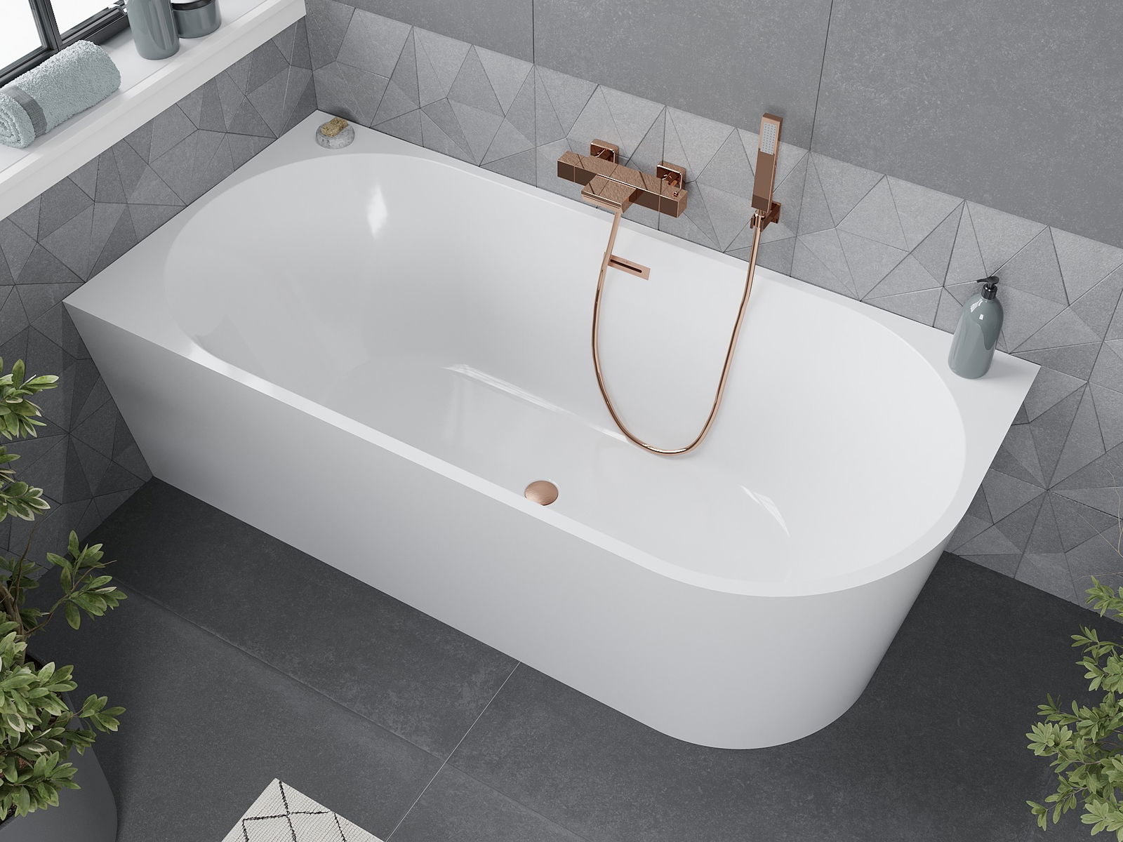 Mexen Mia volně stojící rohová vana levá 160 x 80 cm, bílá, přepad kartáčovaná měď - 52691608000L-65