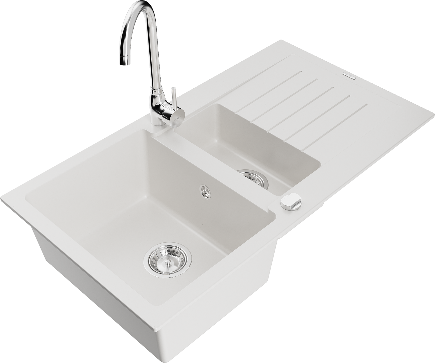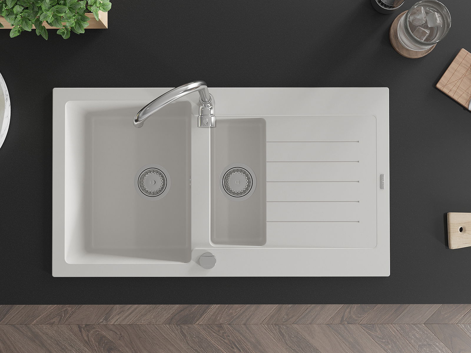 Mexen Matias granitový dřez 1,5-komorový s odkapávačem a kuchyňskou baterií Telma, bílý - 6502-20-670200-00