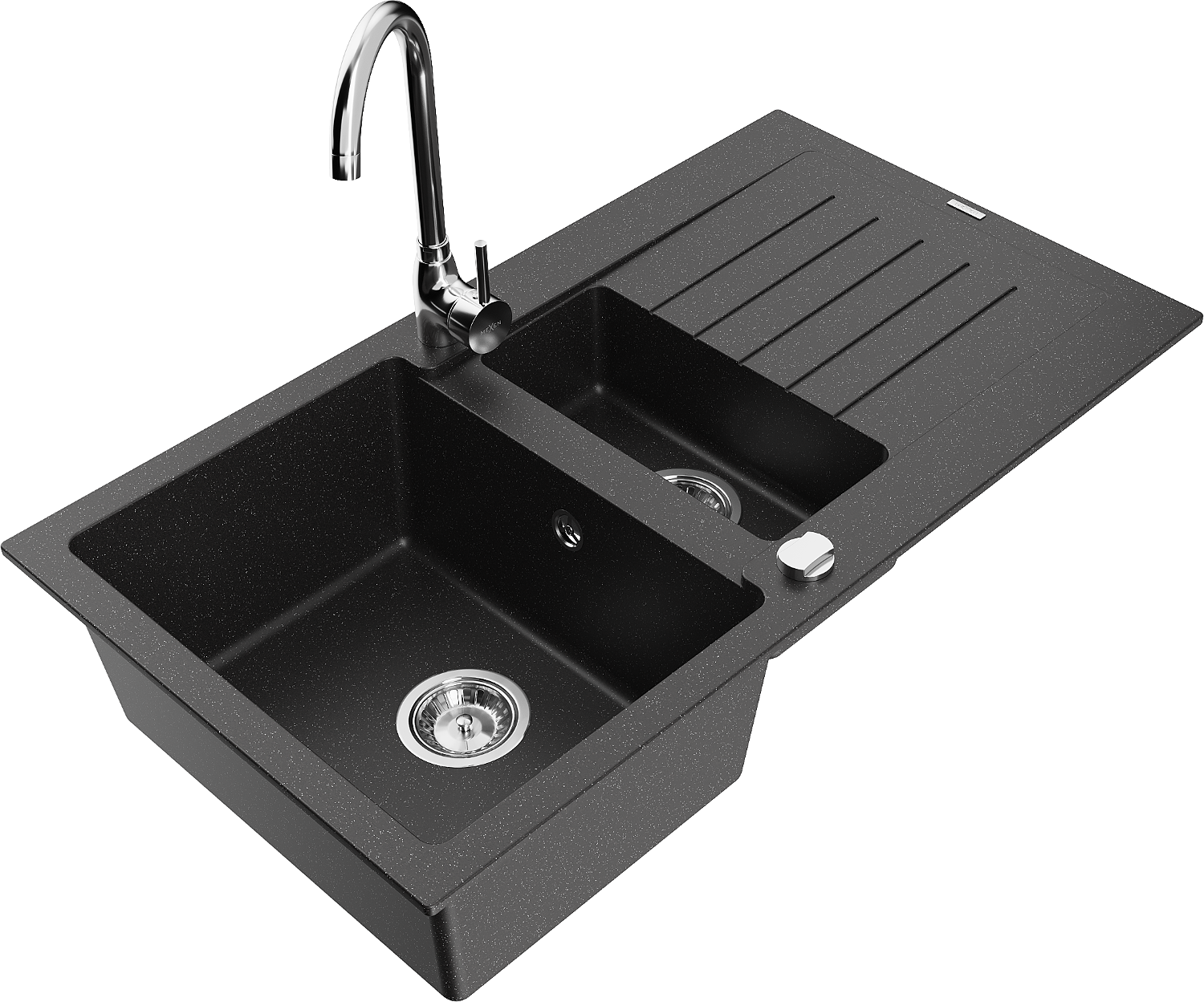Mexen Matias granitový dřez 1,5-komorový s odkapávačem a kuchyňskou baterií Telma, černý/stříbrný - 6502-73-670200-00