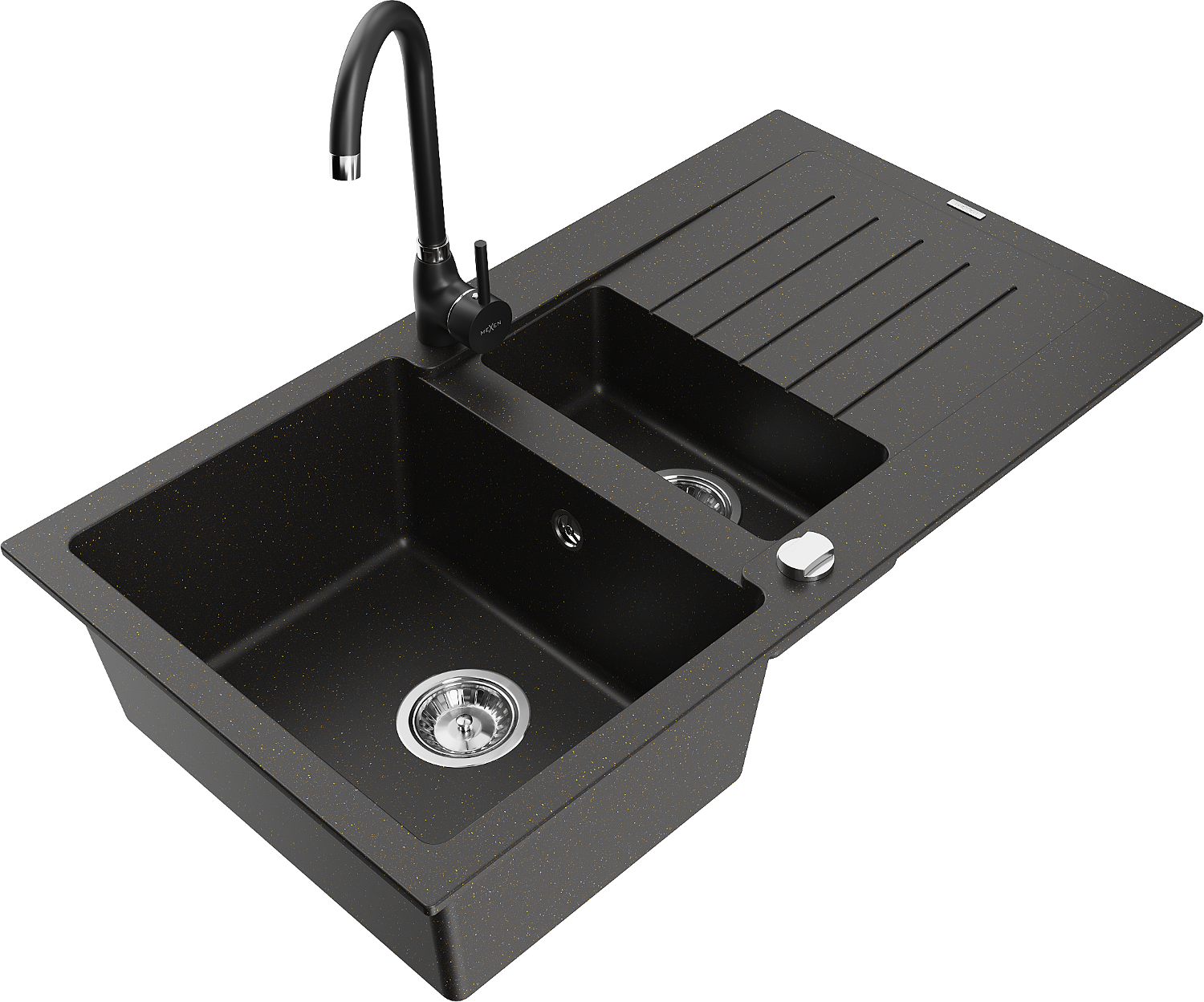 Mexen Matias granitový dřez 1,5-komorový s odkapávačem a kuchyňskou baterií Telma, černý/zlatý - 6502-75-670200-70