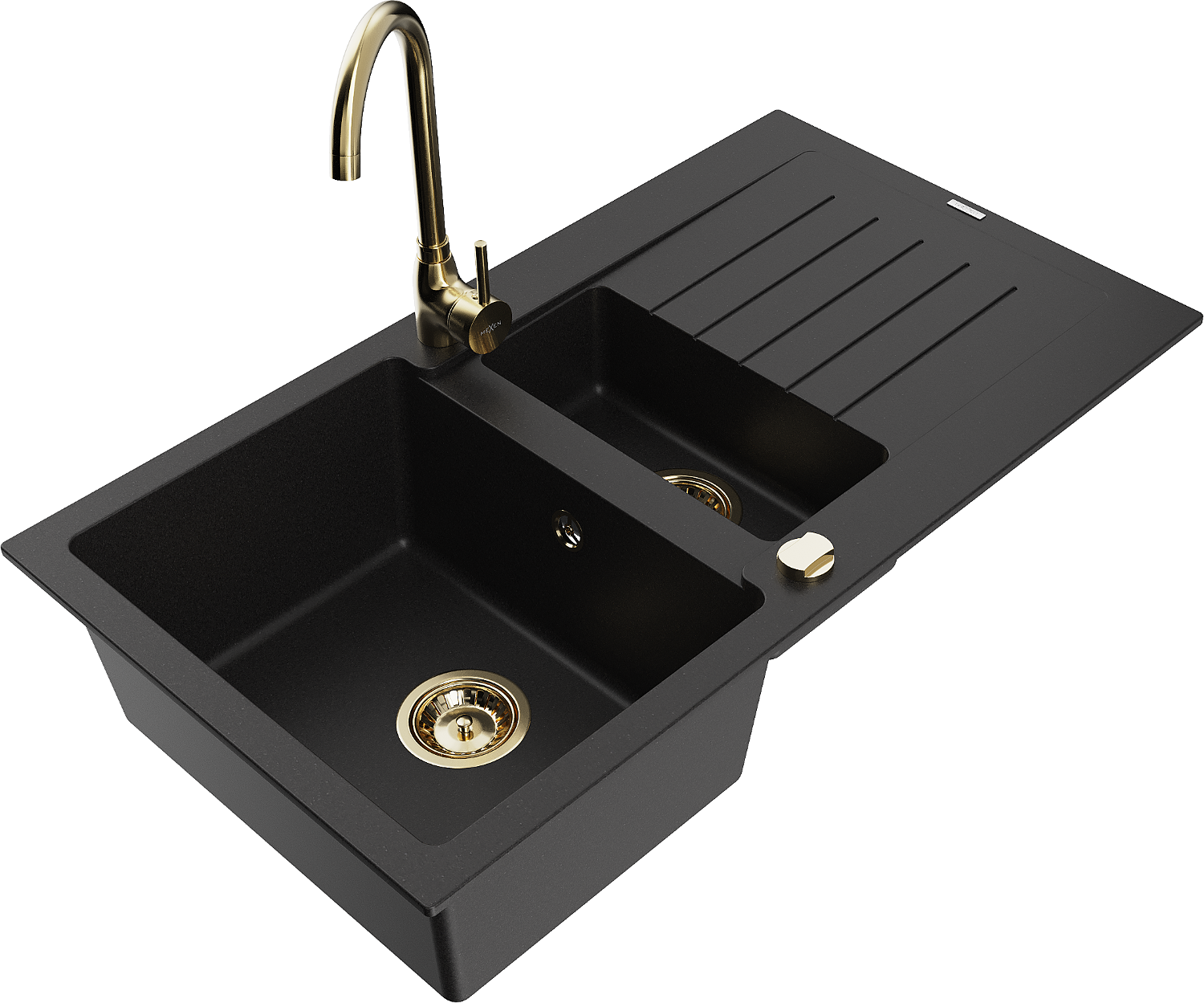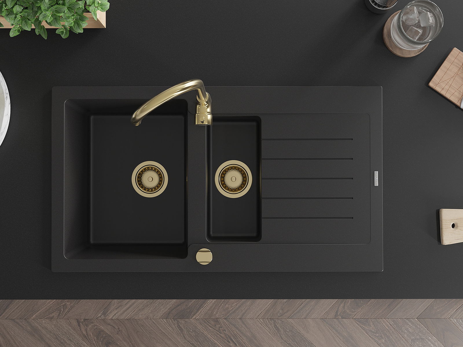 Mexen Matias granitový dřez 1,5-komorový s odkapávačem a kuchyňskou baterií Telma, černý - 6502-77-670200-50