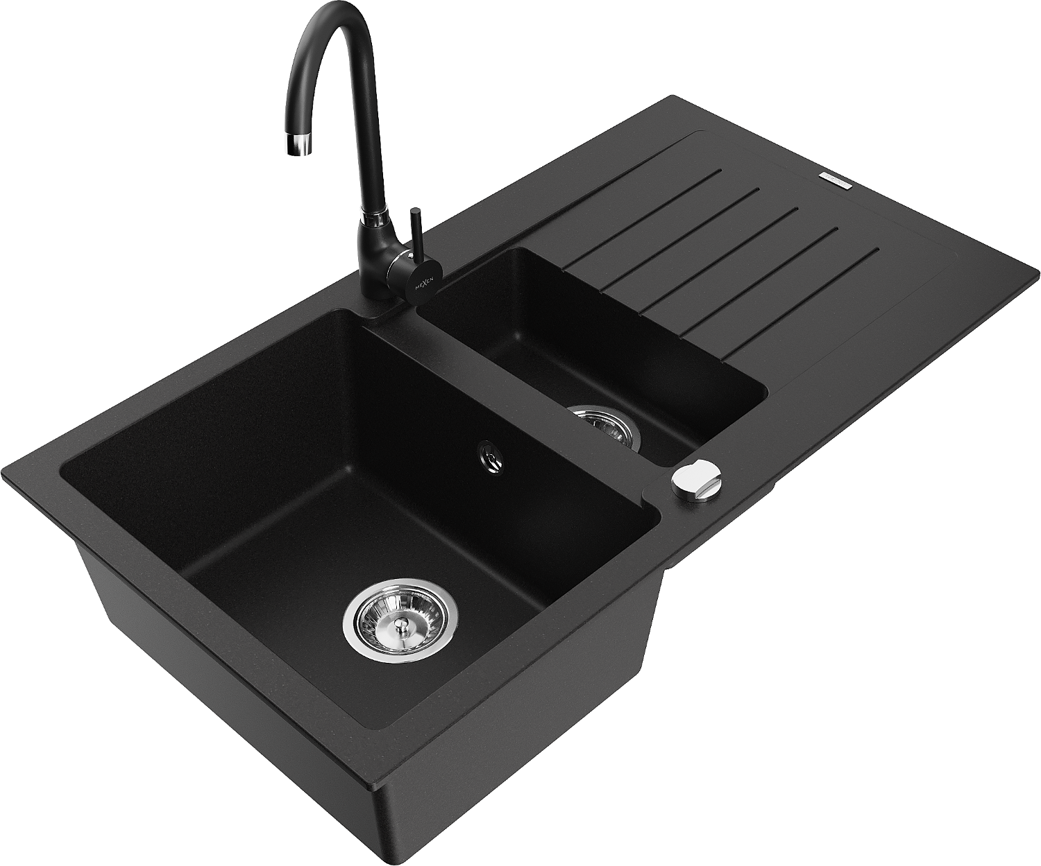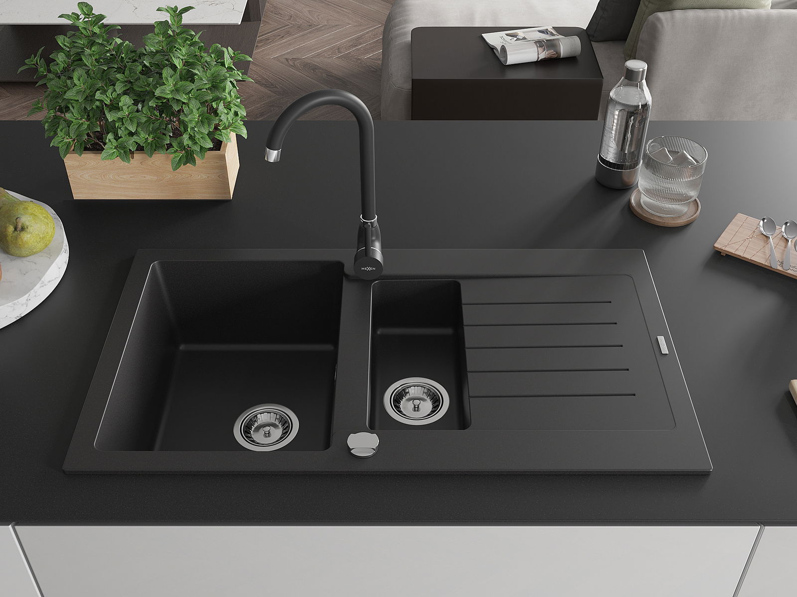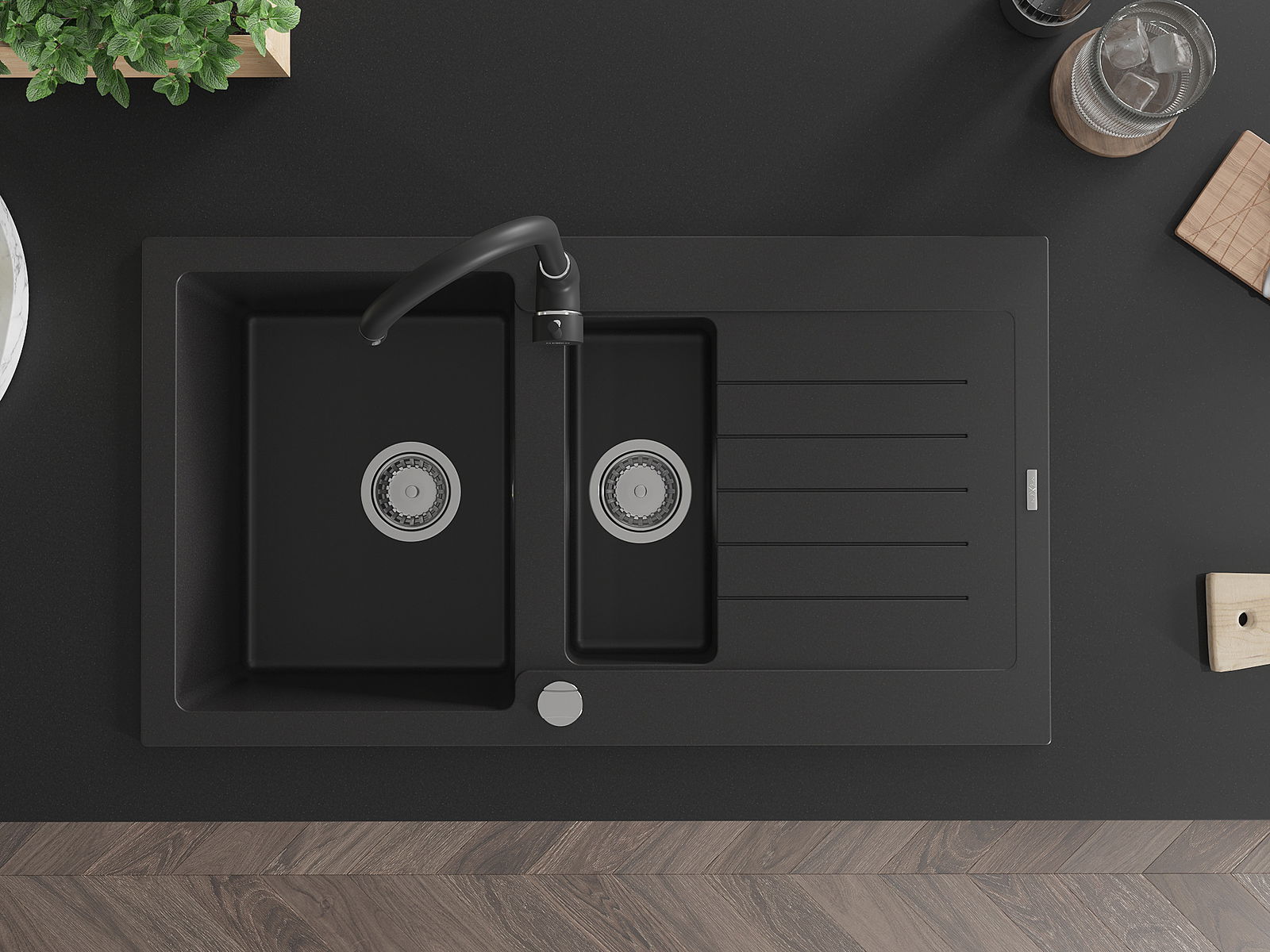 Mexen Matias žulový dřez 1,5-komorový s odkapávačem a kuchyňskou baterií Telma, černý - 6502-77-670200-70