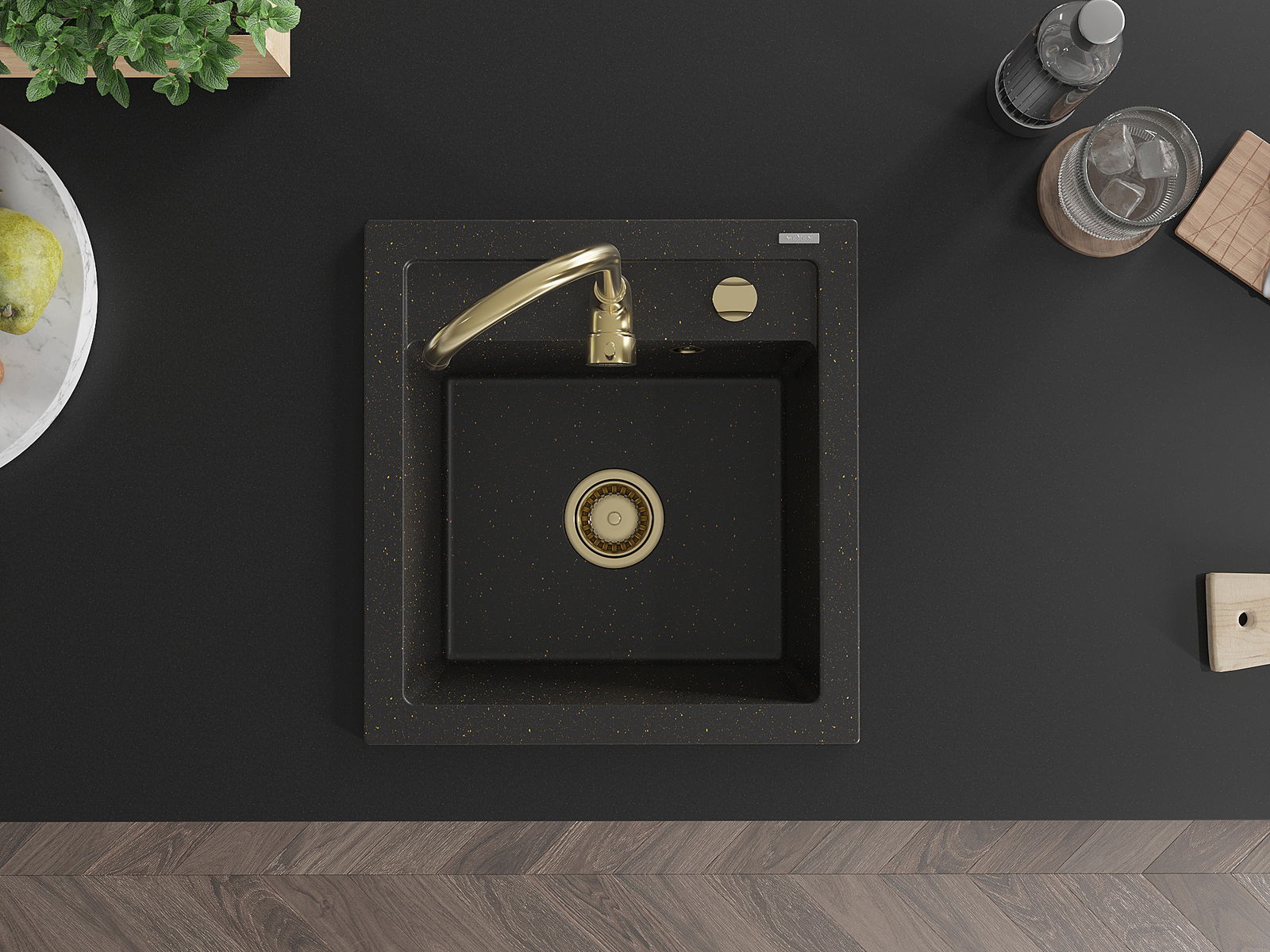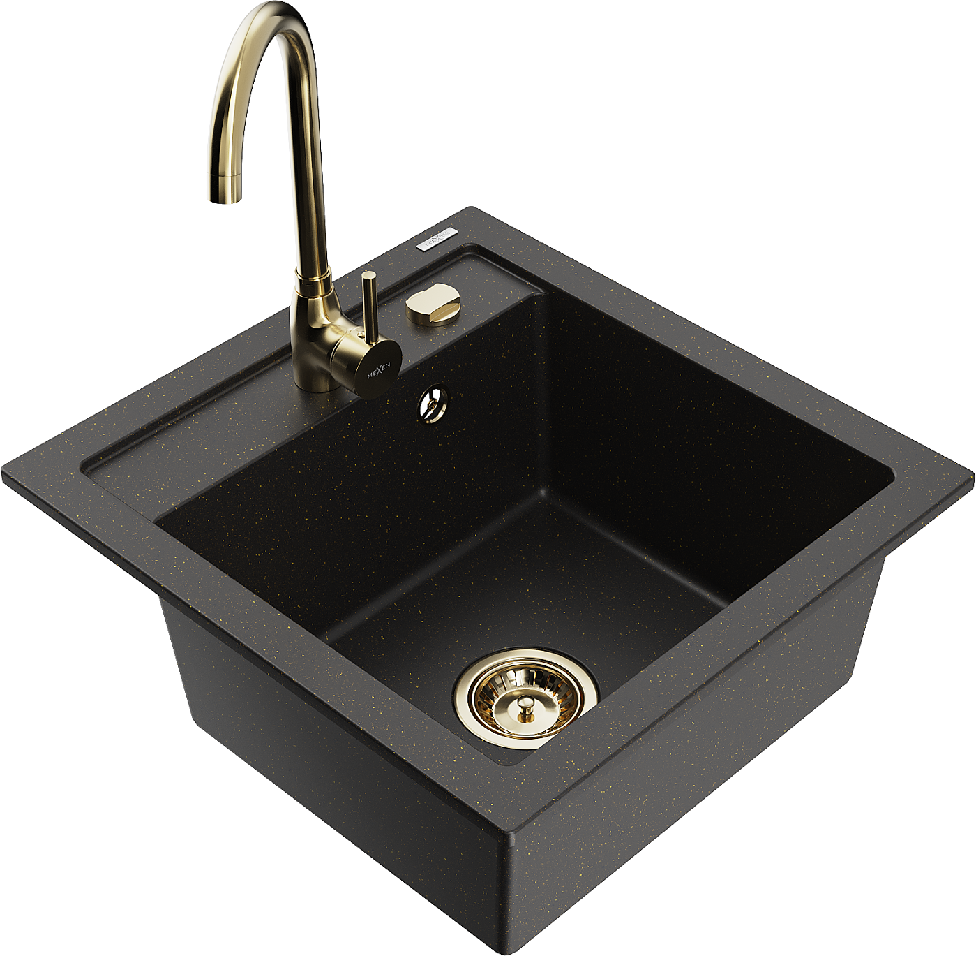 Mexen Vito granitový dřez 1-komorový s kuchyňskou baterií Telma, černý/zlatý metalik - 6503-75-670200-50