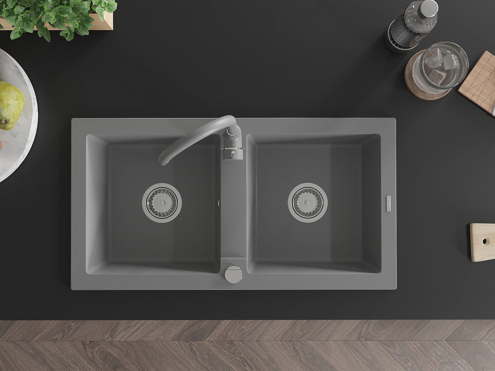 Mexen Mario dvoukomorový granitový dřez s kuchyňskou baterií Telma, šedý - 6504-71-670200-71