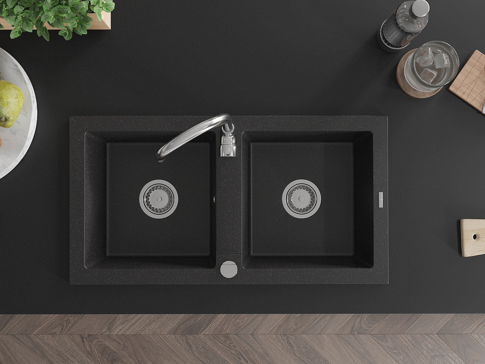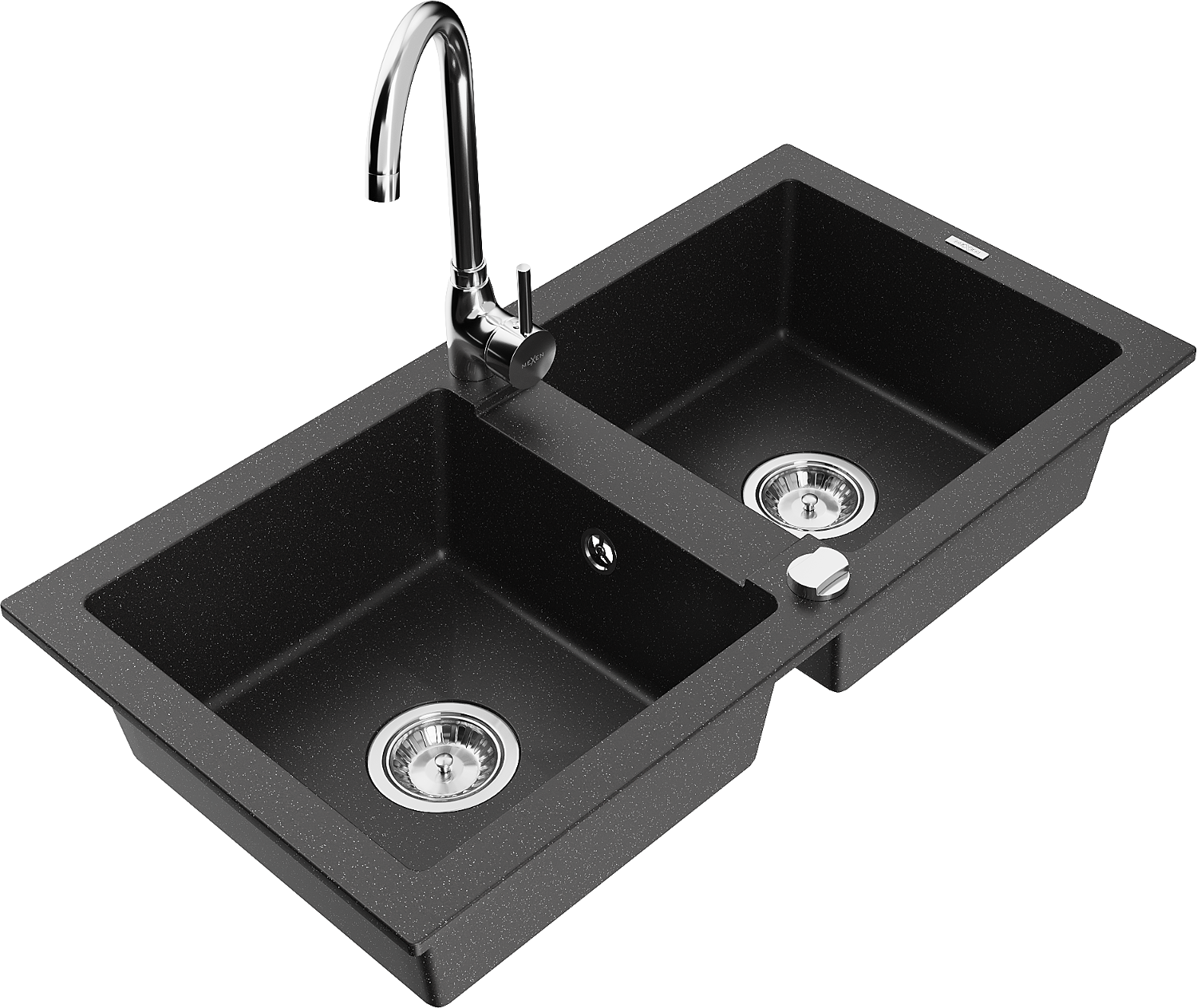 Mexen Mario dvoukomorový granitový dřez s kuchyňskou baterií Telma, černý/stříbrný - 6504-73-670200-00