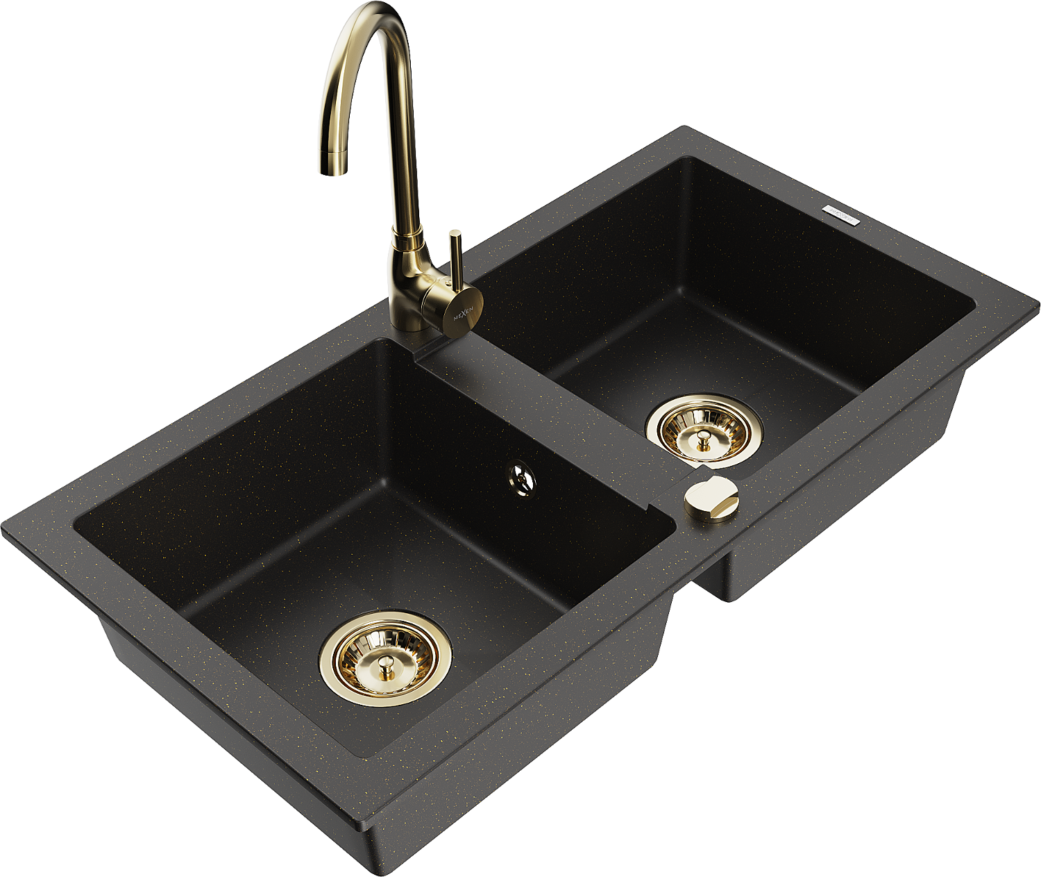 • Mexen Mario dřez žulový 2-komorový s kuchyňskou baterií Telma, černý/zlatý - 6504-75-670200-50