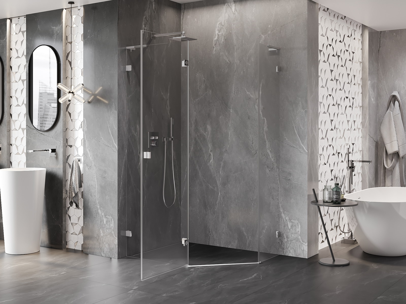 Mexen Lunar L je elegantní sprchová kabina ve tvaru pětiúhelníku o rozměru 90x80 cm, ideální pro moderní interiéry. Vyznačuje se otočnými dveřmi s možností montáže na levé straně, což umožňuje ideální přizpůsobení prostoru. Je vybavena transparentním, tvrzeným sklem o tloušťce 8 mm s povlakem usnadňujícím čištění, zaručuje trvanlivost a snadnou údržbu. Hliníkové profily v chromové úpravě a stabilizátor z nerezové oceli přidávají na trvanlivosti a stylu. Dva systémy montáže a možnost regulace šířky umožňují montáž na vaničku nebo dlaždice. Mechanismus zvedání a spouštění dveří, magnetická lišta a elastomerová těsnění účinně odvádějí vodu, zajišťují plný komfort používání.