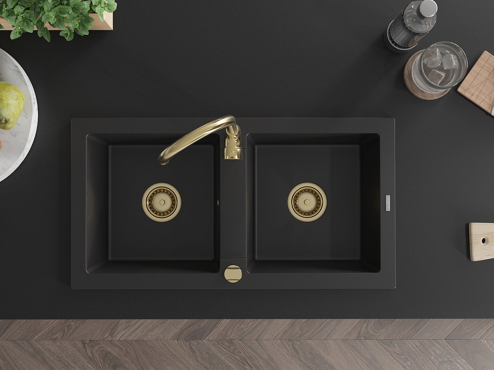 Mexen Mario dřez granitový 2-komorový s kuchyňskou baterií Telma, černý - 6504-77-670200-50